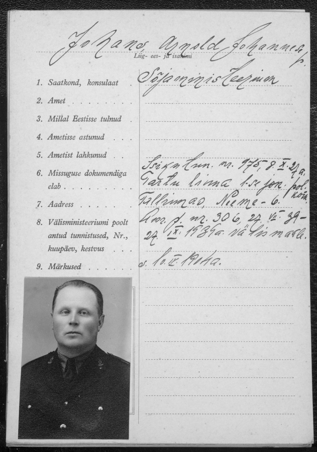 Alljärgnev dokument peaks olema leitnant Arnold Juhansi diplomaatilise passi vormistamise taotlus või siis midagi sarnast. Kas keegi austatud kamraadidest oskab täpsustada?