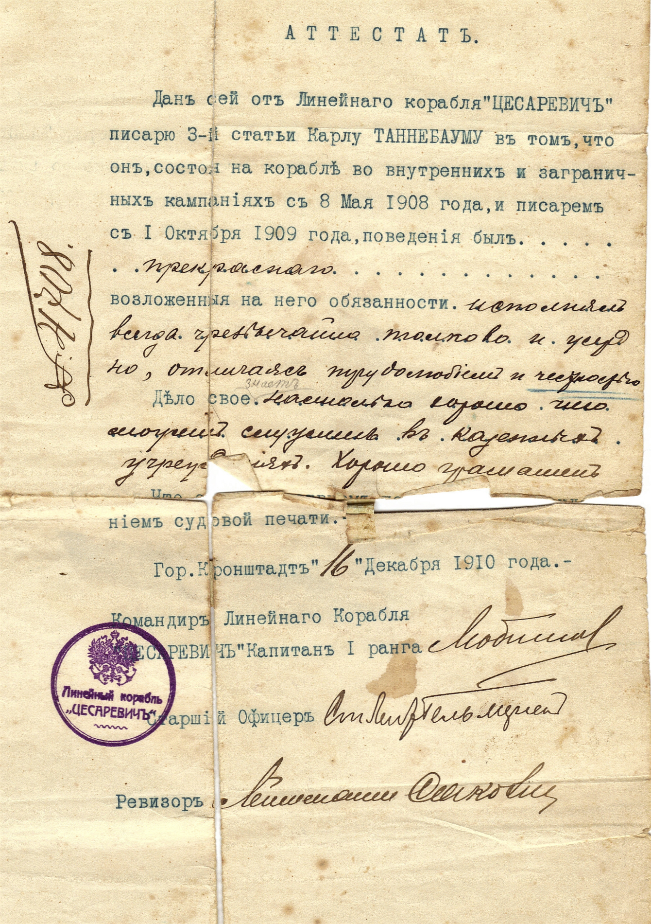 Karl Tannebaum oli elukutseline paberimäärija ning ilmselt seetõttu sai temast kirjutaja ka impeeriumi mereväes. Täpsema teenistuskäigu panen kirja mõni teine päev, aga praegu lisan vaatamiseks mõned dokumendid, mis tänaseks veel säilinud on. Miks ma nüüd selle teema üles ajan on see, et väidetavalt oli tal Messiina maavärina tagajärgede likvideerimisel osalemisel saadud autasule lisaks ka Georgi rist. Ehk leiaks sellele kinnitust ning saaks ta teiste sekka foorumi tublis nimekirjas.