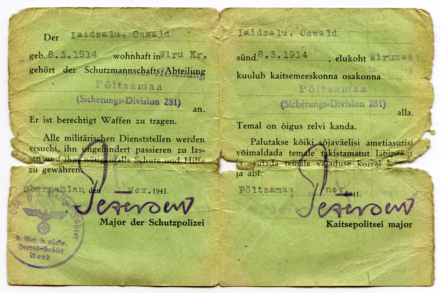 1941. aasta lõpul välja antud Dienstausweis (teenistustõendis) - dokumendi omanik Osvald Laidsalu teenis alates 1941. aasta novembrist Schutzmannschafts-Abteilung Põltsamaa (hilisem 39. kaitsepataljon/politseipataljon) 1. kompaniis. Peale pataljoni likvideerimist 1943. aasta aprillis läks ta Leegionisse ja teenis 46. Eesti SS rügemendis (tema Soldbuch'i pildid on sama foorumiteema 1. leheküljel).