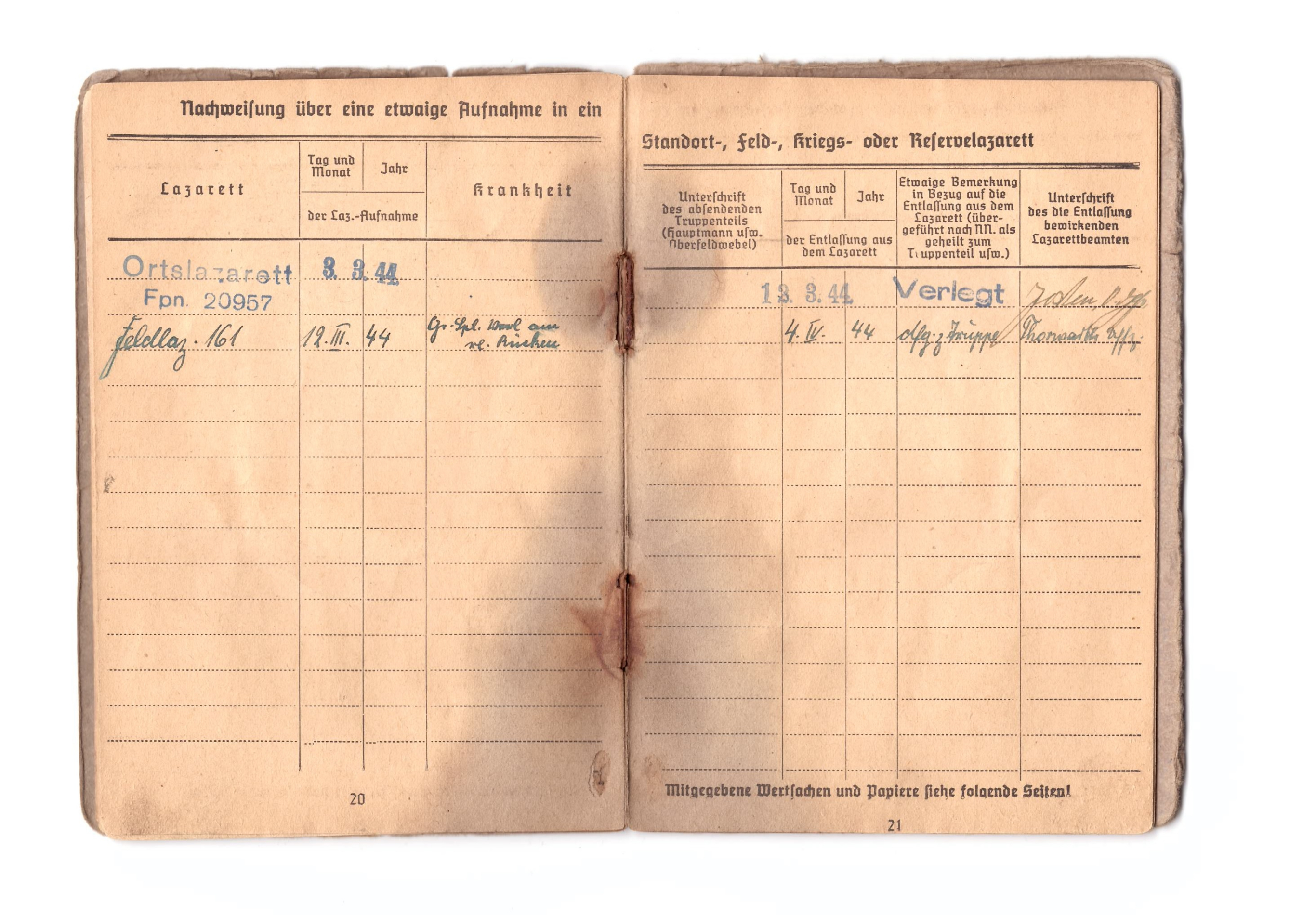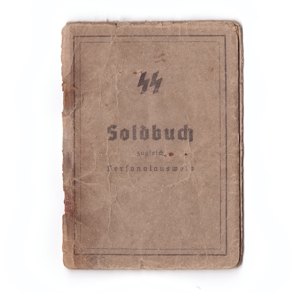 SS-Frw.Grenadier Verner Loos´ile kuulunud Soldbuch. Vähestest märgetest huvitavaim on sissekanne granaadi(mürsu) killust haavata saamise kohta.