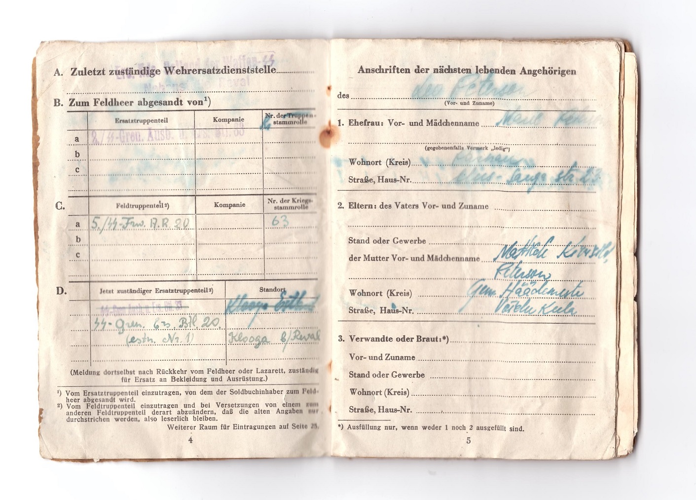 SS-Frw.O.Grenadier Leo Peterson´i Soldbuch. Klooga Soldbuchile omaselt on sissekandeid hõredalt. Küll aga leiab varustuslehelt huvitava märke, et talle on kätte jagatud Tarnjacke.