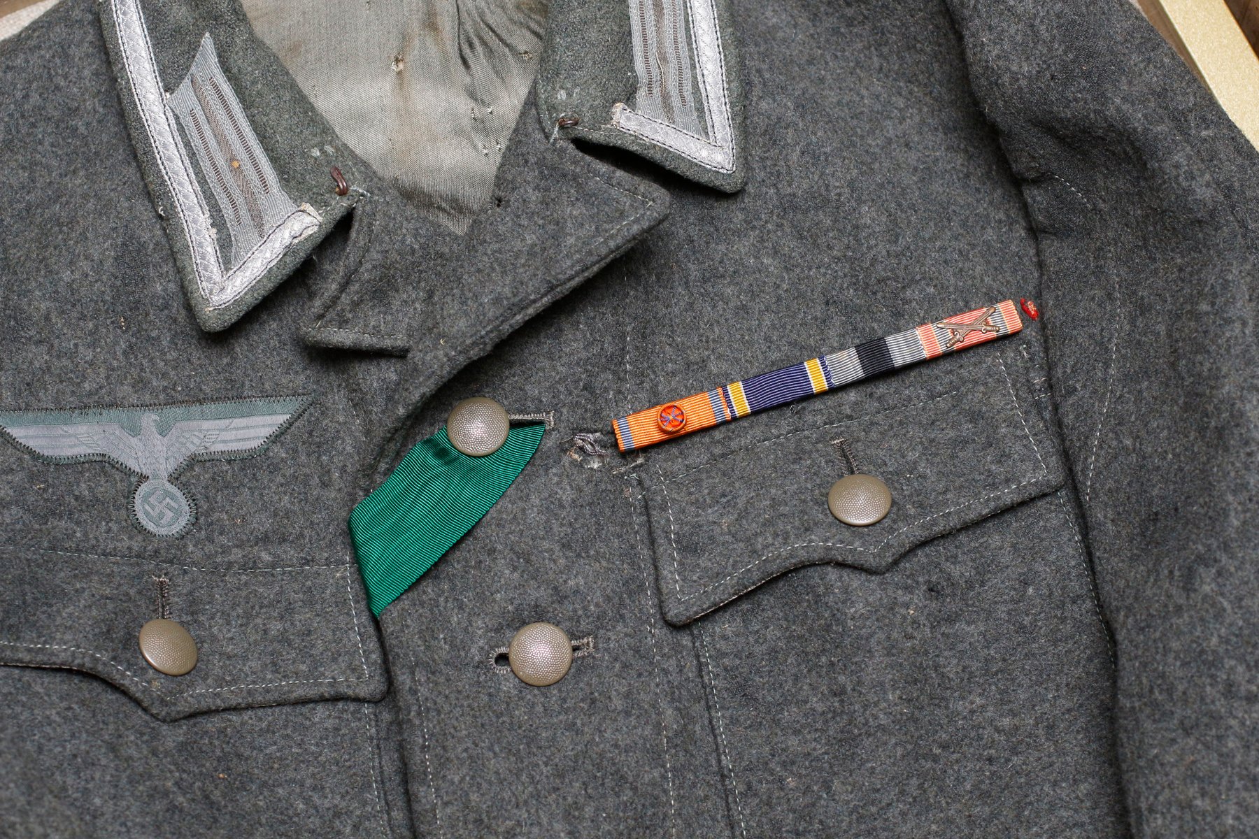 Pildil on vormikuub täpselt sellisena nagu oli leidmishetkel ja kõik embleemid on peale õmmeldud sõja ajal. Vasaku rinnatasku kohal on olnud pikk autasude lindilõige (nelja autasu lindid), mis on rinnast ära rebitud. Taskuklapi vasakus nurgas on näha veel väike jupp kollase triibuga punast linti - medal "10. aastat Läti Vabadussõjast". Selle lindi olemasolu tähendab, et vormikuue omanik on võtnud osa ka Eesti Vabadussõjast ja selle raames ka Landeswehr'i sõjast. Vormikuue vasaku hõlma sees on näha roheline lindijupp, mis on jäänud sinna Ida-ala Rahvaste Vaprusmedali III klassi autasu lindist. Selle medali tõttu võib oletada, et vormikuue omanik liitus juba 1941. aasta sügisel mõne Saksa sõjaväe alluvuses fomeeritud Eesti üksusega ja võttis osa lahingutest Venemaal.