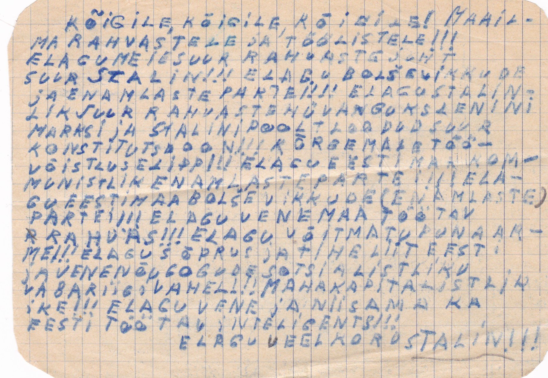 Vanaproua,kelle käest selle vihulehe sain, teadis rääkida,et sellis tekstiga lehti oli vedelenud Tallinna tänavatel küll ja veel.Kas keegi on midagi sellist näinud?