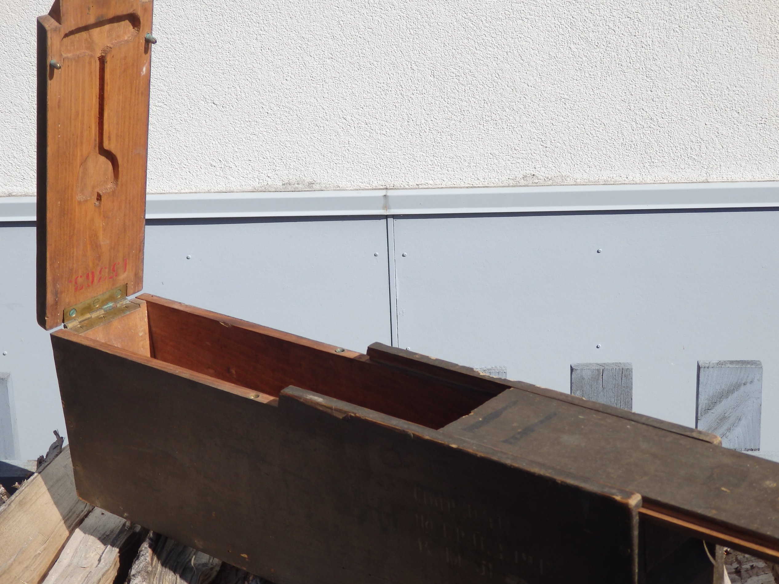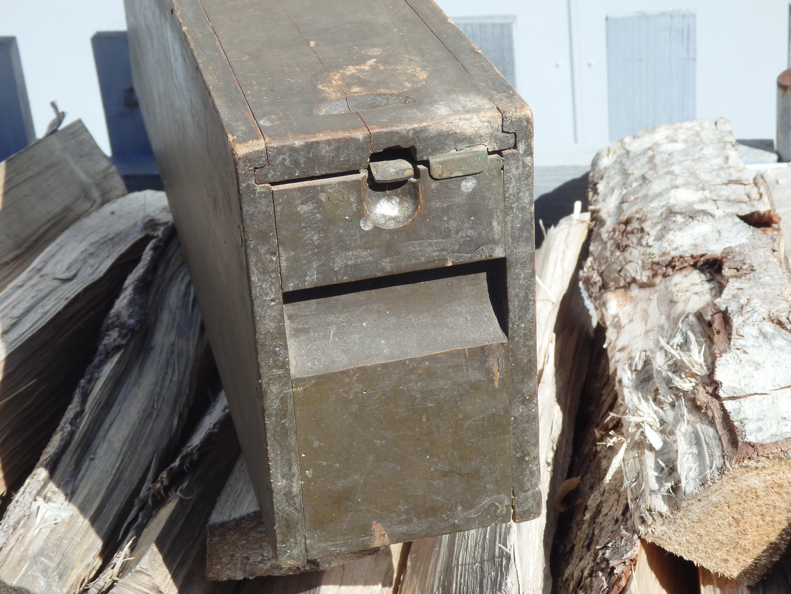 Osad tähed tunduvad olema kirillitsas ? Avamissüsteem on vinge . Näppudega kangutad tsipa messingust avajat ja kast avaneb , ühtlasi ka teine pool kaanest . Loen välja nii : СНАР. .... Ha ..ГP. Й 12 Г. K.M.Л.