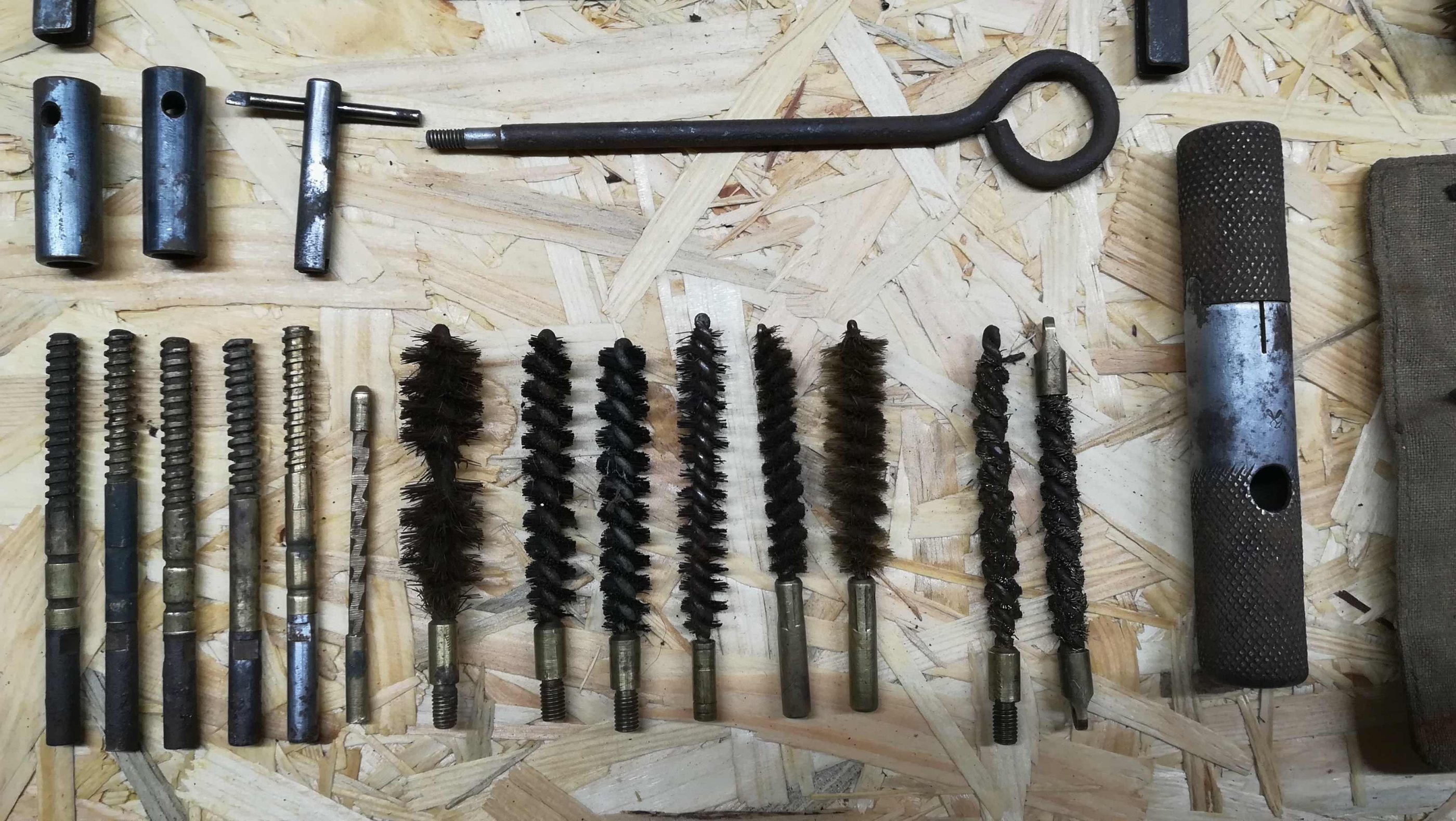 Ostsin hiljaaegu puhastuspinalite sisu assortiikarbi. K98 komplekti panin kokku ja ülemine rida on sama kraam. Need pööratava otsaga vardad peaks ppsh omad olema, see jämedam hari karbi all vast mingi hilisem jahirelv ja too L kujuline varras peaks olema FN Browning oma (aga ilmselt mitte HP, vaid mingite vanemate mudelite jagu). Riidest kott- saan aru, et SVT oma, aga ilmselt justkui vähem levinud, sest tegu on tehasest tulnud kolme nööbiga isendiga, hiljem enam nii palju nööpe ei jagunud. "Toru" pinal on mosina oma, need vasakul keskel olevad virblid ja võti peaks SVT jagu olema, aga kõvera otsaga varras ja harjahunnik vajaks veel suunamist. Kõige parempoolsemal kahel harjal on peale pressitud "K" ja üldiselt ei tundu need vene nägu olevat.