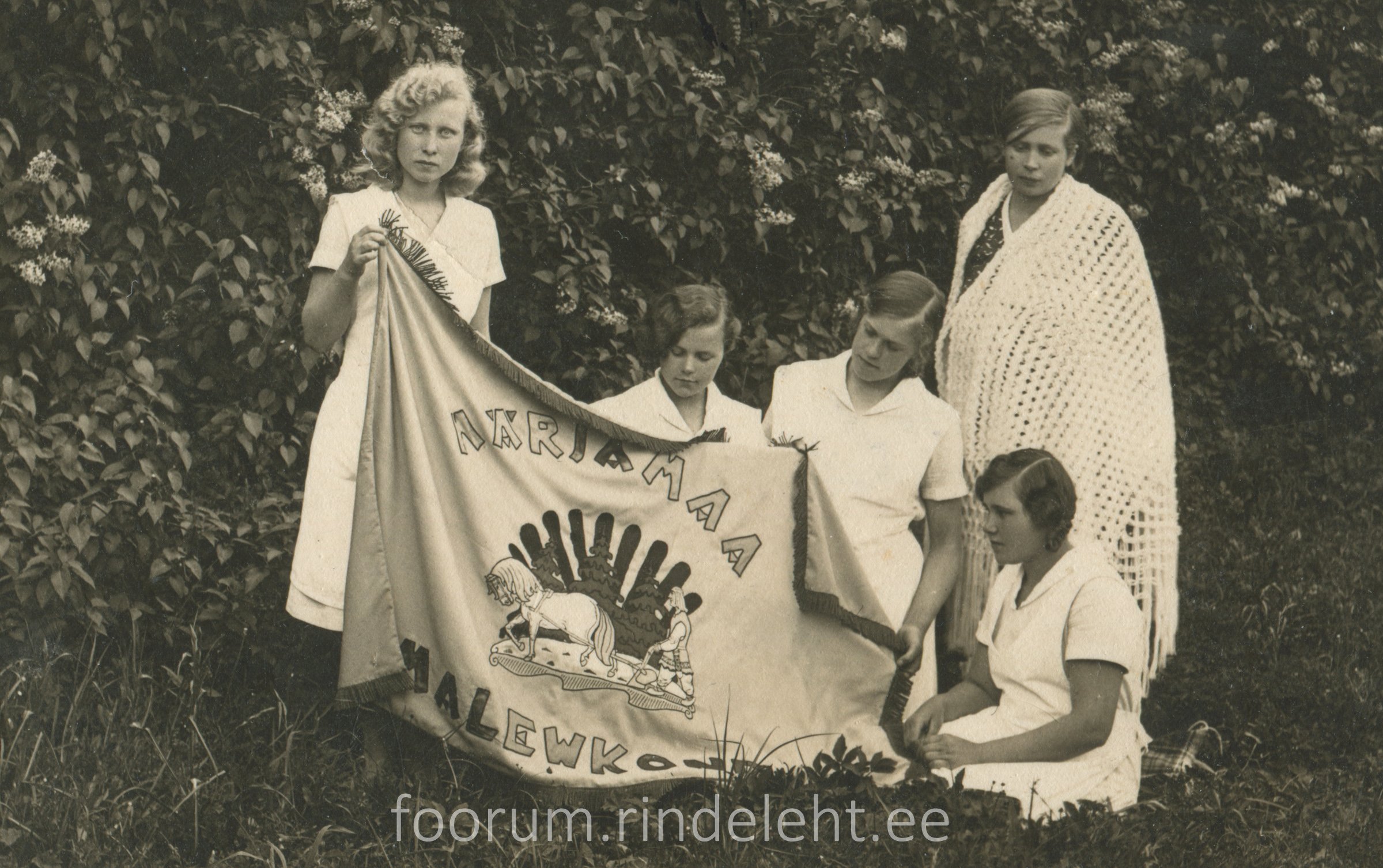 Kehtna Kodumajanduskooli näitsikud esitlevad Kaitseliidu Lääne maleva Märjamaa malevkonna lippu.