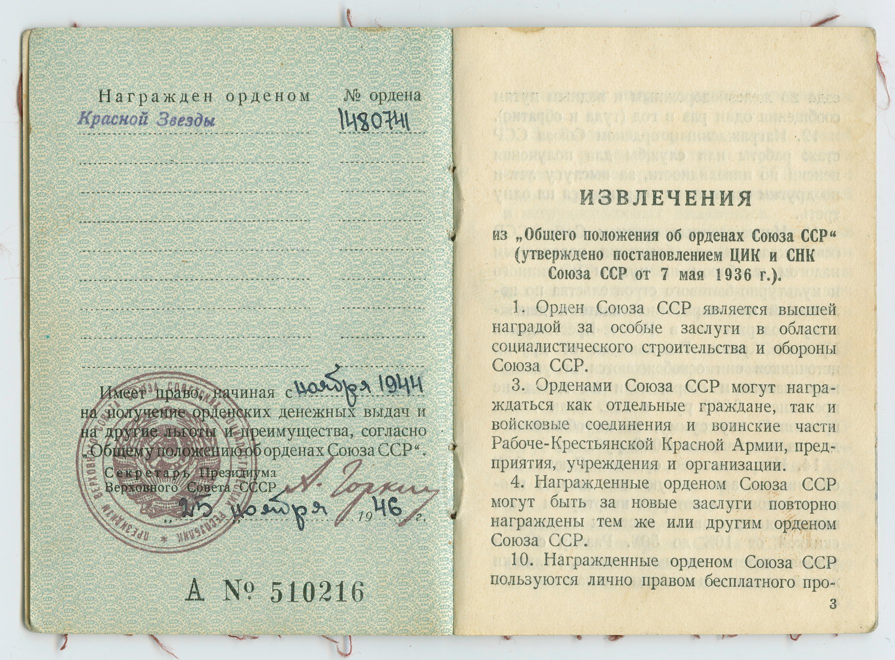 Punatähe ordeni (1480741) kavaleri Karl Kask'i ordeniraamat.