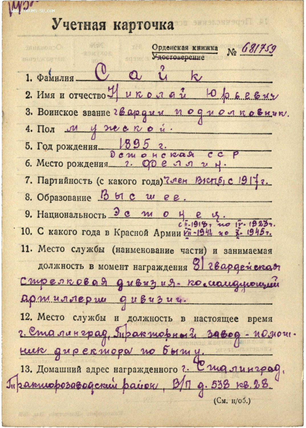 Aleksander Nevski orden nr. 20848, antud eestlasele. Viljandis 1895. a sündinud, kuid ilmselt venemaale välja rännanud Nikolai Jüri p.Saik. Autasulehelt leiab lisainfot.
