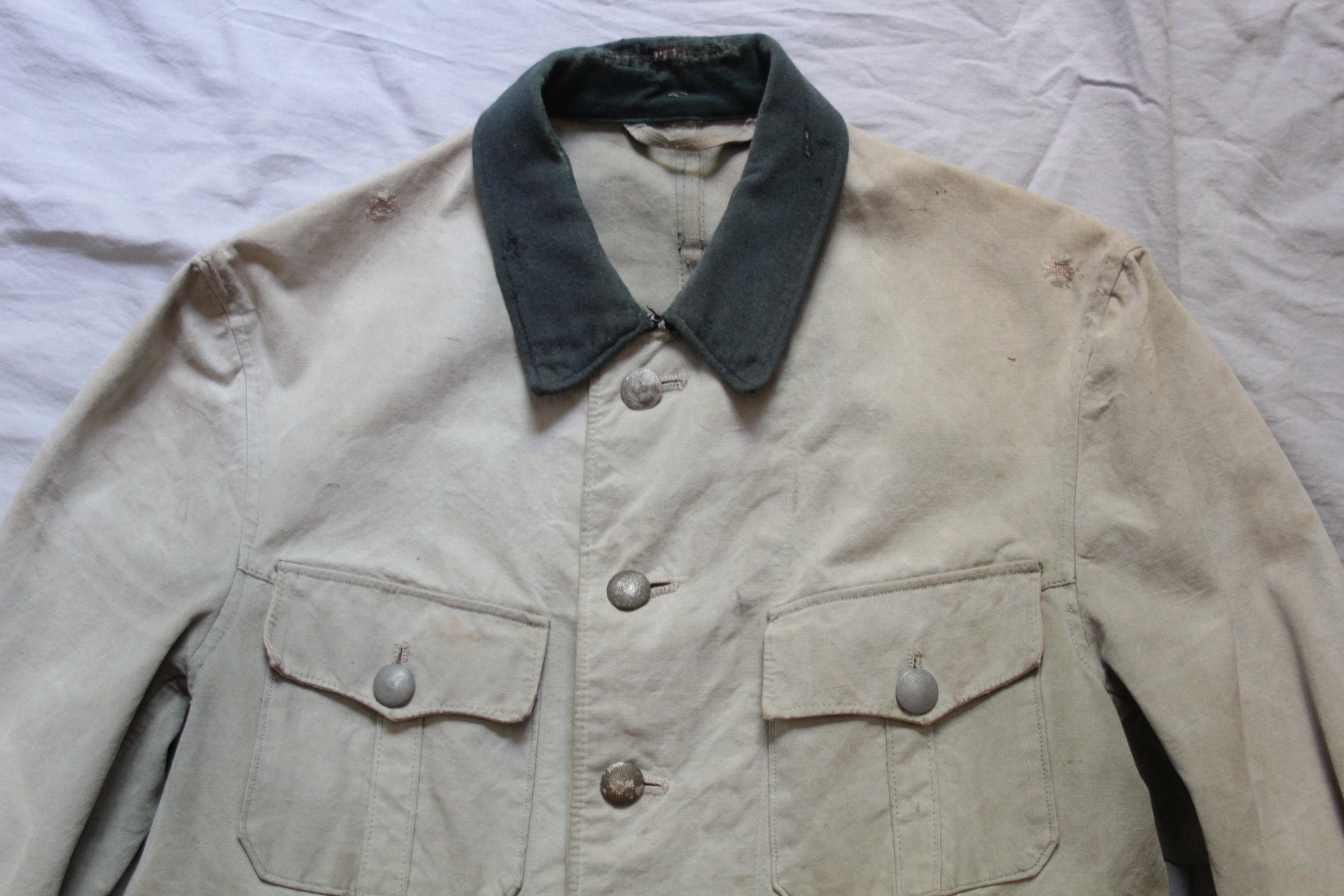 Jakk tehtud vene telkmantlist. Kasutatud kahte eri tooni palatkat. Tüüpiline idarinde rätsepatöö. Originaalis olid ees ainult rinnatasku nööbid.