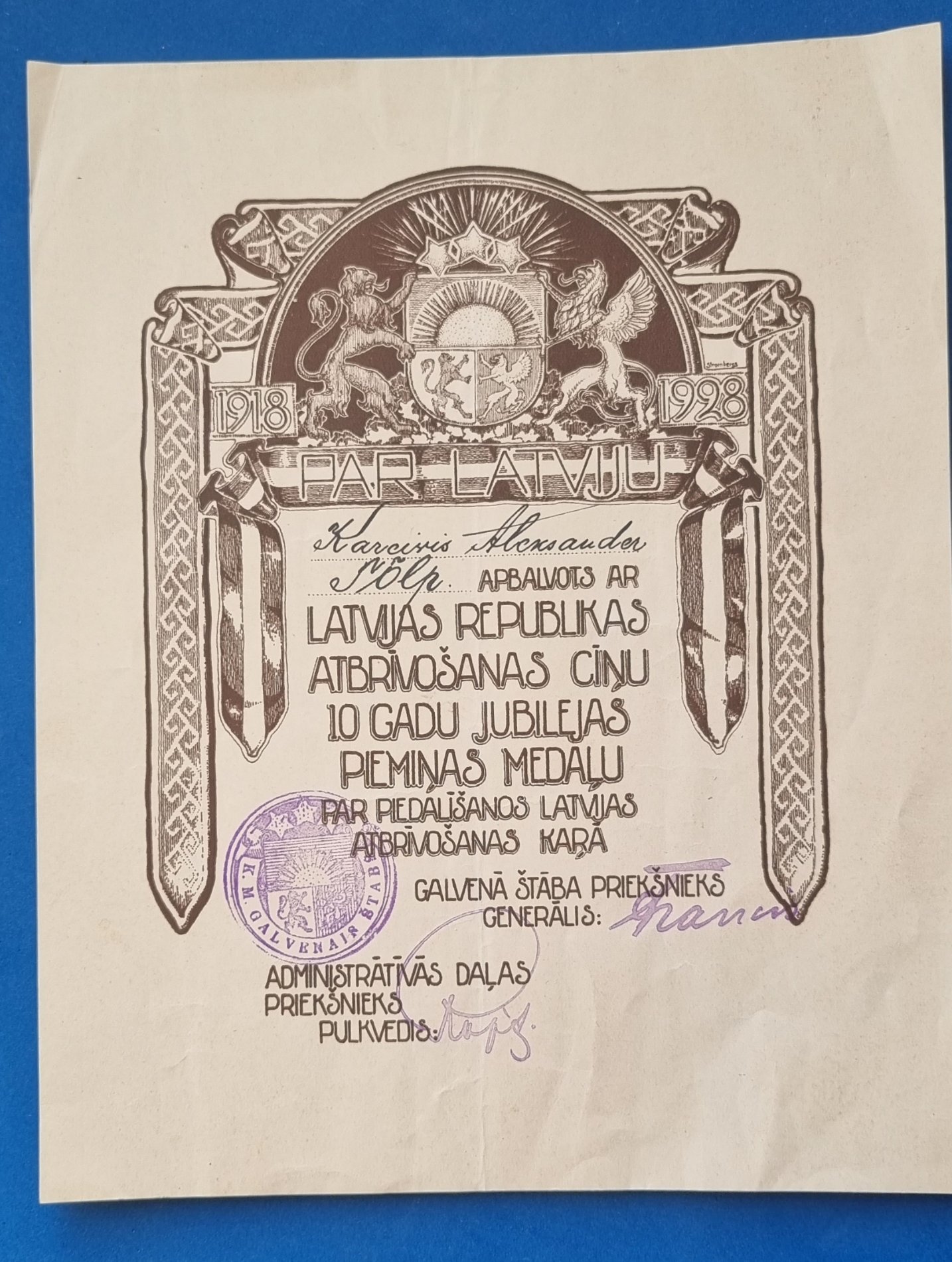 Pärnust sain 2 sellist tunnistust, antud rahvaväelasele Aleksander Tōlpile. Läti medali tunnistus peaks levinud olema aga see sanitari oma on huvitav. Ei tea kas sellisele märk kah juures käis ning kaua selliseid kursuseid tehti?
