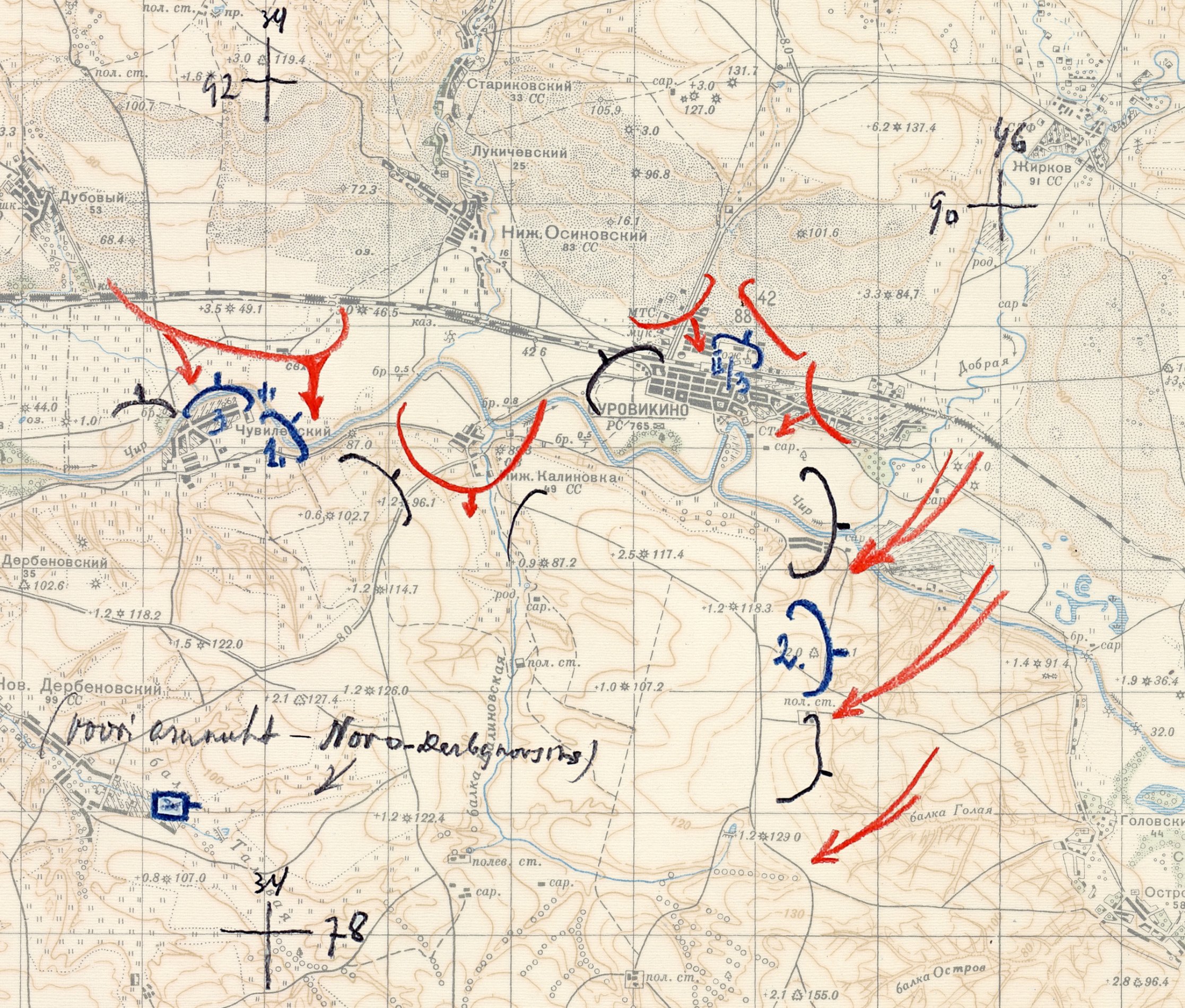 Õigem on ilmselt siiski Tarmo Mägi antud kuupäev ja Surovikinost taanduti välja 14. detsembri öösel. Lisan siia juurde Riipalu poolt joonistatud skeemi, mis asetatud Punaarmee 1:100 000 M-38-122 kaardile.