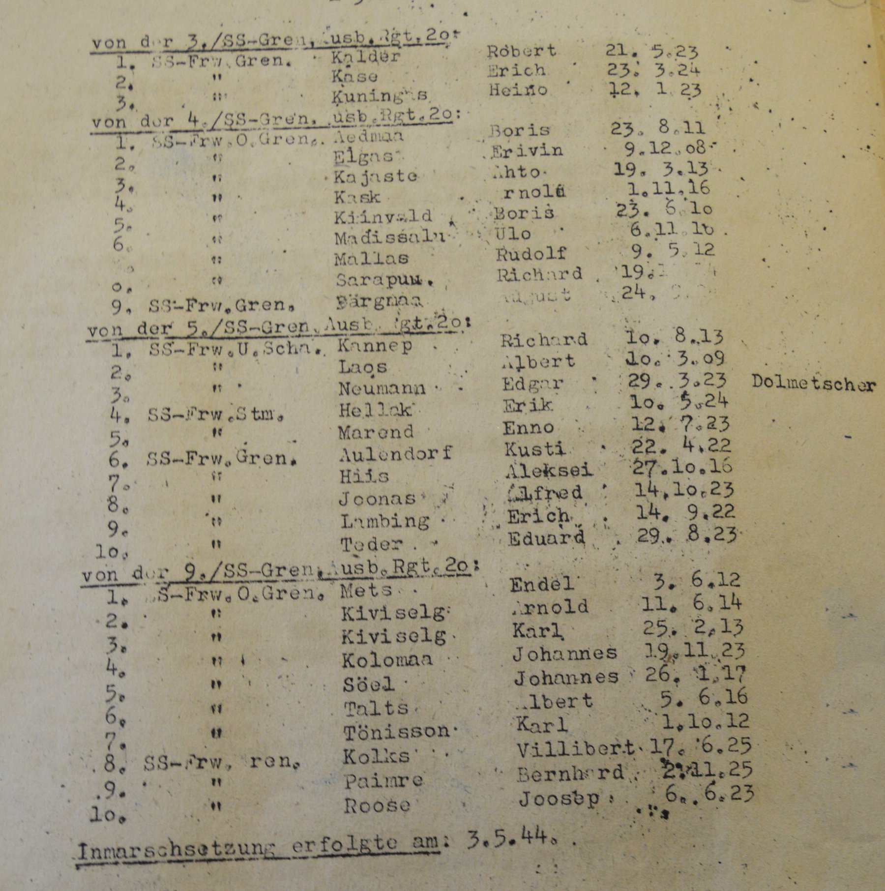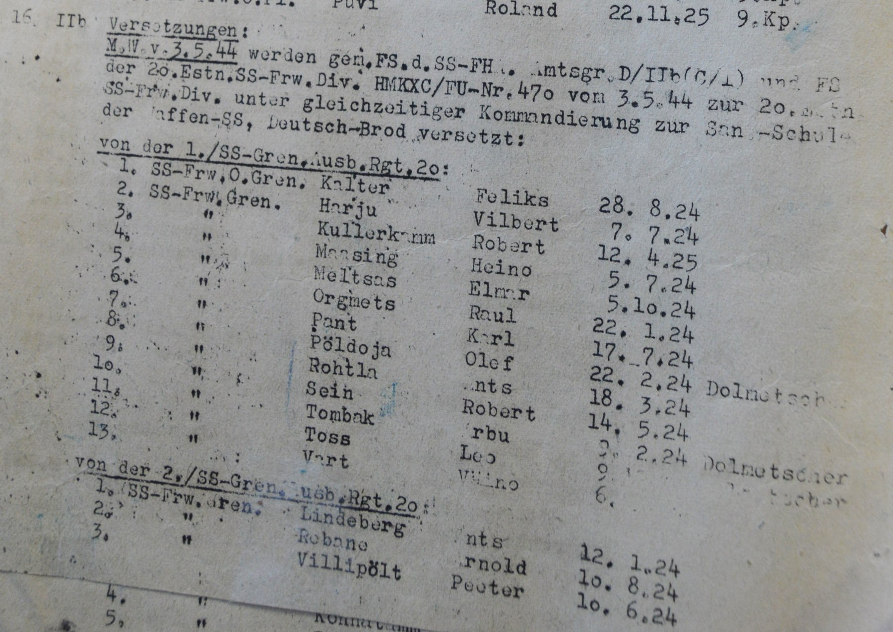 1944. aasta mai alguses Deutsch-Brod'i määratute nimekiri. Erinevatest 20. SS väljaõpperügemendi kompaniidest kokku 48 meest, suurem osa või isegi kõik need mehed peaks olema ka eelnevalt postitatud grupipildil.