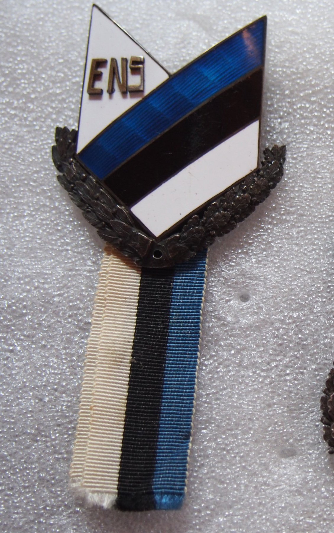 Sinise-musta ja valge kuumemailiga märk. Mõõdud 12x16 mm. Esiküljel tähed E N S. Taha lõigatud number 44. Kas see tähendab aastaarvu või järje numbrit? Märgi tegemise aeg võiks olla viimase sõja ajal? Märgi materjal on hõbe.