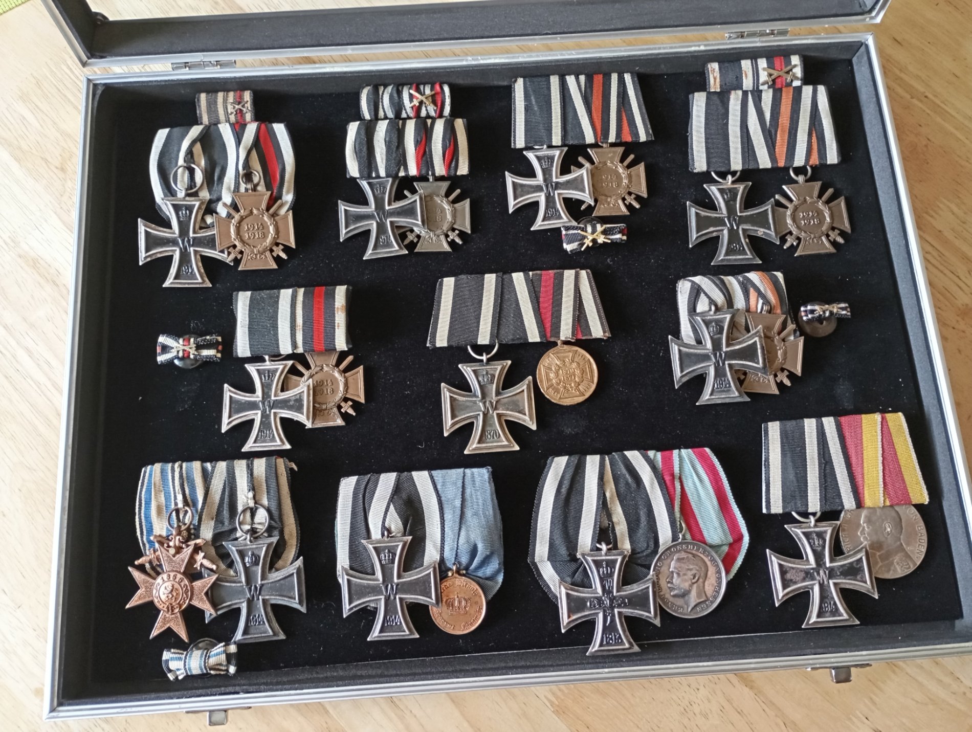 Vitriin nr 2 - teemaks 1MS keisriSaksa raudristipaarid // EK1914 ühes tolle sõja mälestusristiga (ülemised) või erinevate saksa riikide EK-ekvivalentidega (alumised).. vitriini pärl on keskel: Prantsuse-Preisi sõja aegne EK1870 ühes tolle sõja mälestusmedaliga