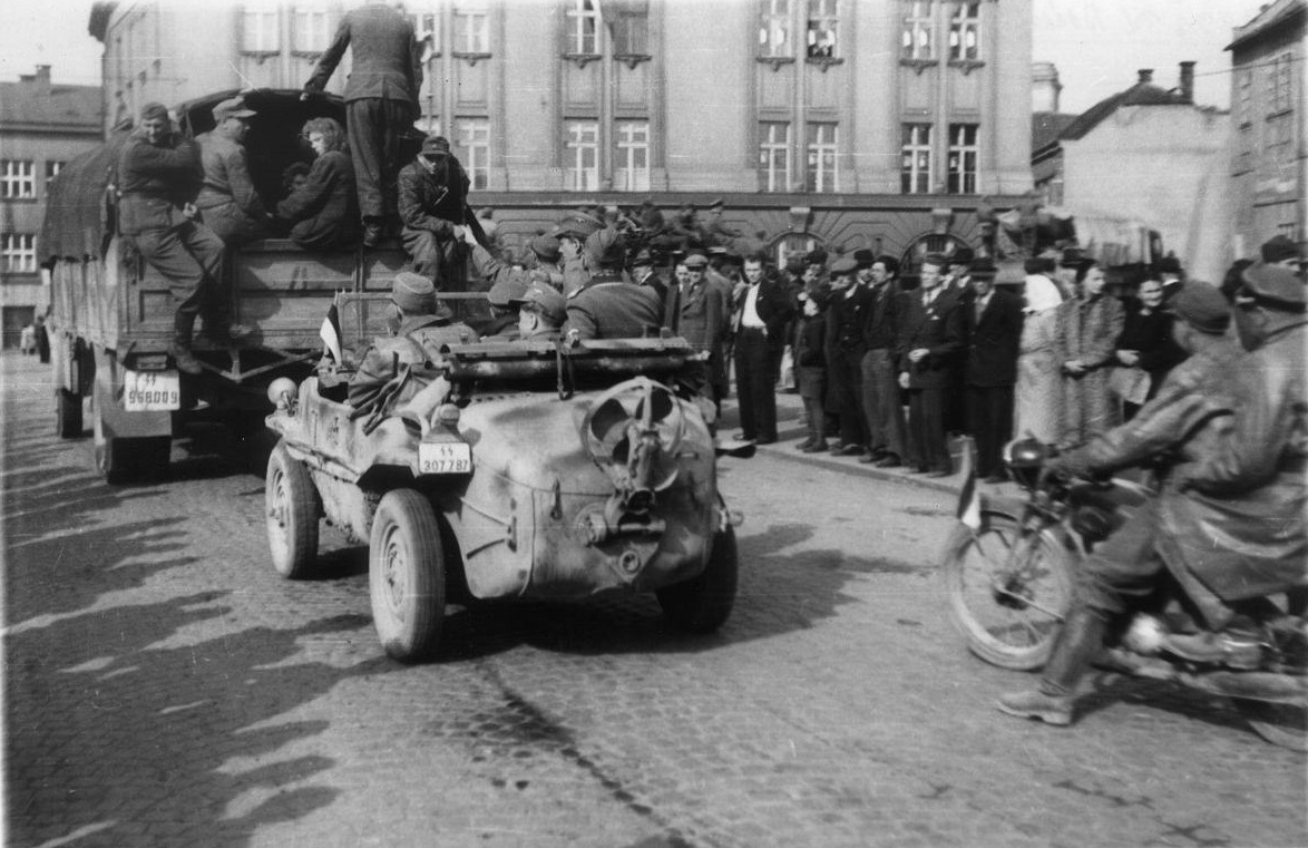 Eestlaste Schwimmwagen, numbrimärgiga SS-307787,Mlada Boleslav, Tšehhi, 10.05.1945. Parema kvaliteediga foto Jacek Cieleck'i raamatus "Porisse tallatud lootus. 20. SS-Div. okt.1944-mai 1945." lehekülg 236.