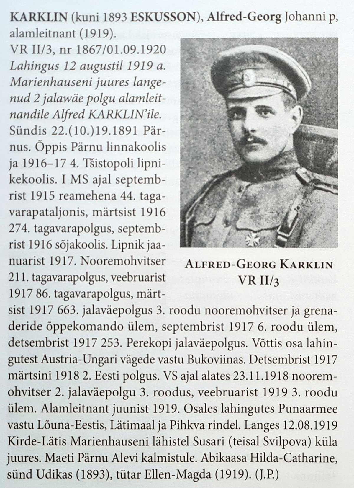Eile USA'st tagasi Eestisse jõudnud alamleitnant Alfred-Georg Karklin'i Vabadusristi II liigi 3. järk. Karklin langes 1919. aasta 12. augustil ja postuumselt annetatud VR anti üle Karklin'i lesele.