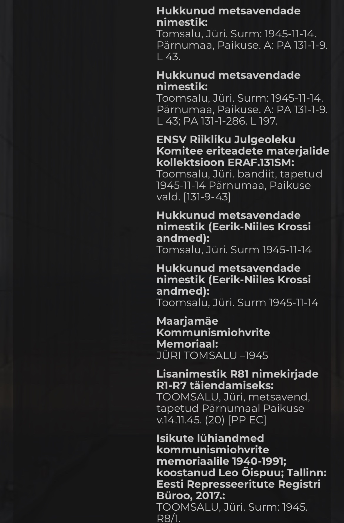 Memento raamatust: TOOMSALU, Jüri, m, s. 17.11.1921 Pärnumaa, Halinga v. Saksa sõjaväes, sõdur, Eesti Leegion 03.01.1943, 20. Grenaderide Väljaõppe- ja Tagavarapataljon. [ERA.R-67.1.10,6b]