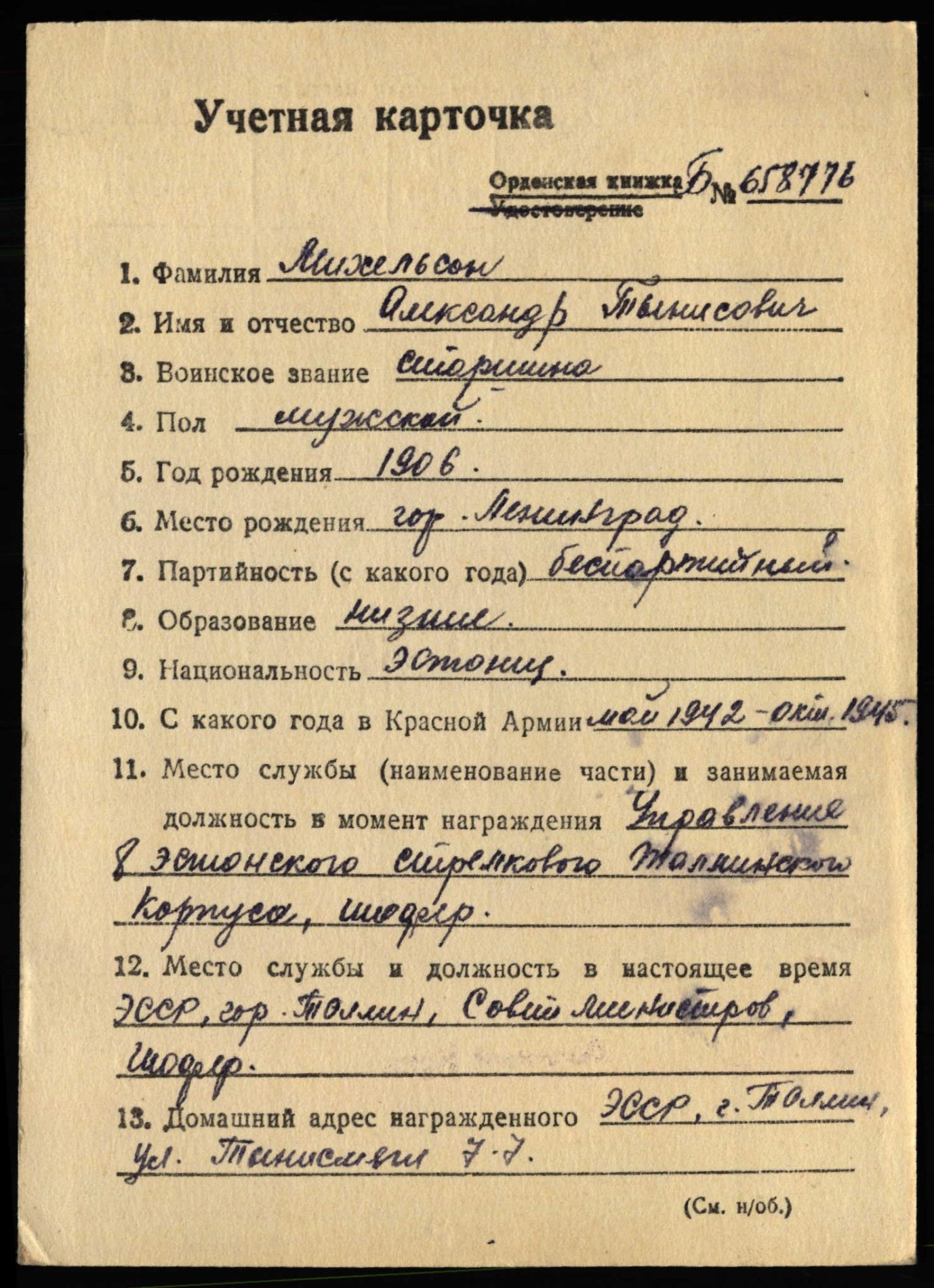 Kui Punatähe ordeni nr. 939477 kavaleriks on 8. Eesti Laskurkorpuse poliitosakonna autojuht, vanemseersant Leopold Karu, siis Punatähe ordeni nr. 939478 kavaleriks on 8. Eesti laskurkorpuse juhtkonna vanemautojuht, vanemseersant Aleksander Mihelson. Mihelson on autasustatud ka Lahinguteenete medaliga nr. 2046415