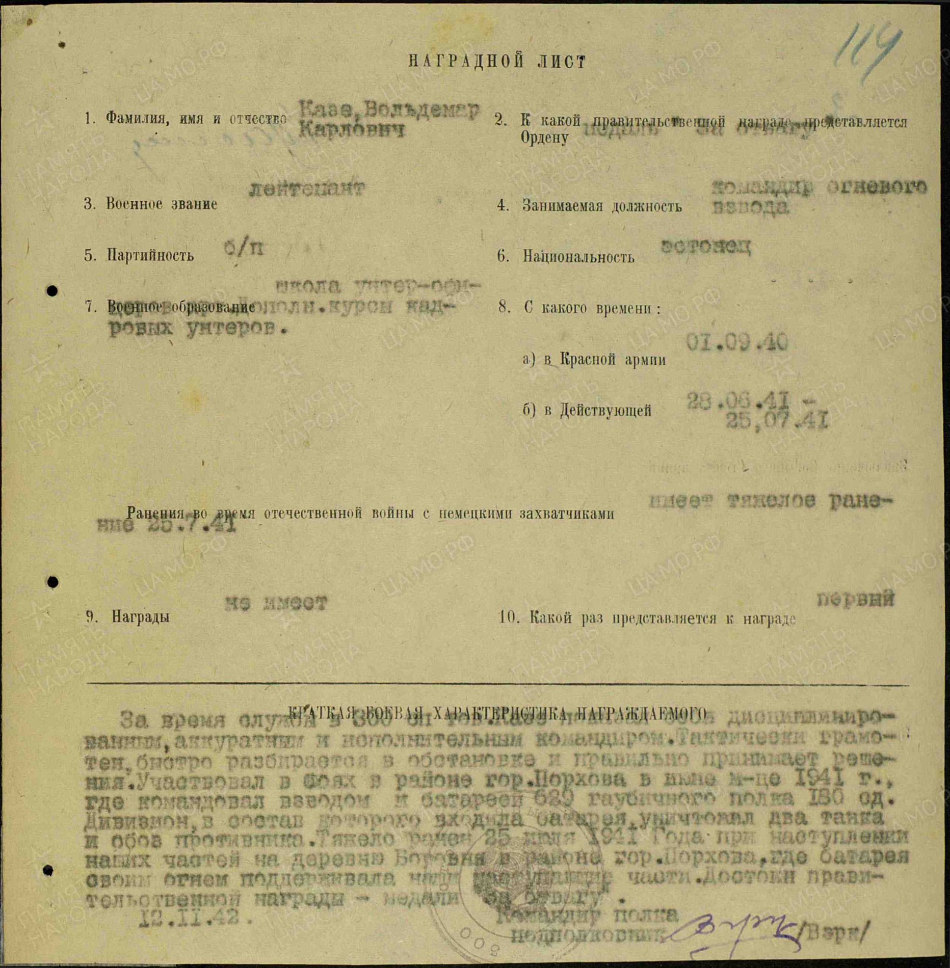 Leitnant Voldemar Kase, 7. Eesti laskurdiviisi 300. laskurpolgu laskurrühma komandör. Vapruse medali nr. 135176 ja Punatähe ordeni nr. 1889891 kavaler.