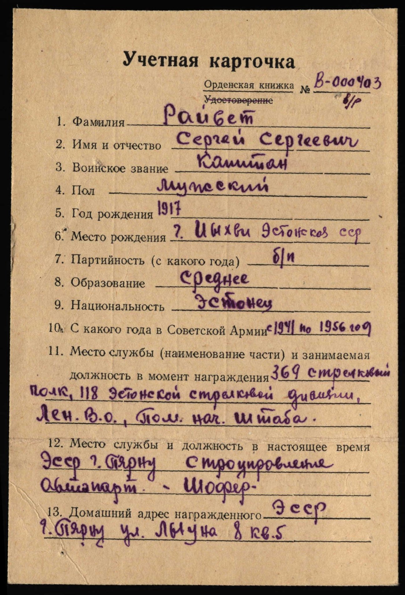 Kapten Sergei Raivet, 249. Eesti Laskurdiviisi, 921. laskurpolgu, 5. laskurroodu 50mm miinipildujate rühmakomandör. Punatähe ordeni nr. 1480688 kavaler. Lisaks on teda autasustatud veel ühe Punatähe ordeniga, mis kannab numbrit 3536526 ja ilma numbrita Lahinguteenete medaliga. Viimased kaks autasu on ilmselt antud Punaarmees väljateenitud aastate eest.