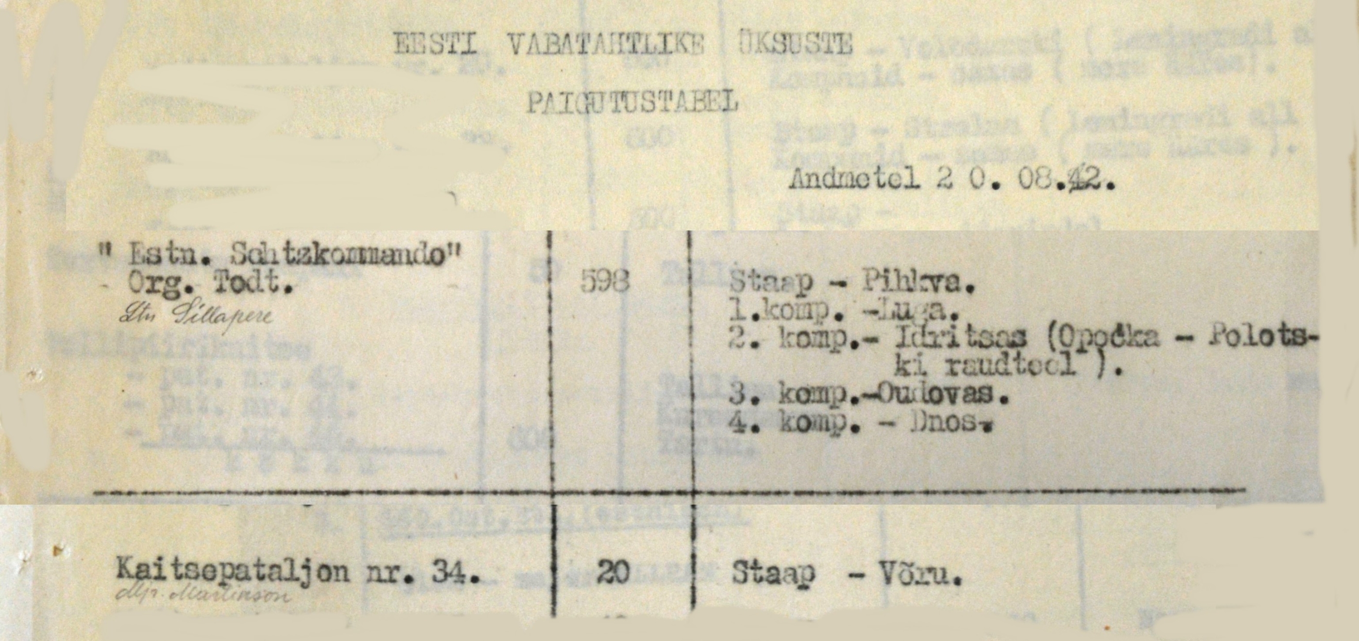 1942. a nõudis organisatsiooni “Todt” üksuste tegevus Pihkva piirkonnas lisajõude raudtee kaitseks. Selleks anti 56-meheline 34.pataljoni staap organisatsiooni “Todt” käsutusse ja saadeti Võrru, kus SS-Untersturmführer Schusteri juhtimisel värvati 607 meest. Pataljon saadeti raudtee kaitseks Pihkvamaale ja allus organisatsioonile “Todt”. Pataljon tegutses kuni Saksa vägede lahkumiseni Eestist (seda fakti ei oska ma kommenteerida, sest ei tea kus asus pataljon 1944.a. suvel- Pihkva oli ju vallutatud).