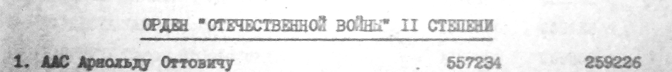 Isamaasõja 2. kl orden nr. 557234, antud üksiku eriülesannetega üksuse luuregrupi radistile partisan Arnold Aasale. Aas sai oma ordeni kätte 1945.a Toompeal ENSV Ülemnõukogus, suurema partisanide grupi autasustamise käigus. Seni ei ole ma kahjuks leidnud rohkemat infot, et kelle partisanigrupis Aas tegutses. Tema kohta ei ole infot ei nõuka ajal ilmunud raamatutes ''Rahvatasujad'' ega ka ERR audioarhiivis. Aga eks andmekandjaid on muidugi veel kus tuhnida.