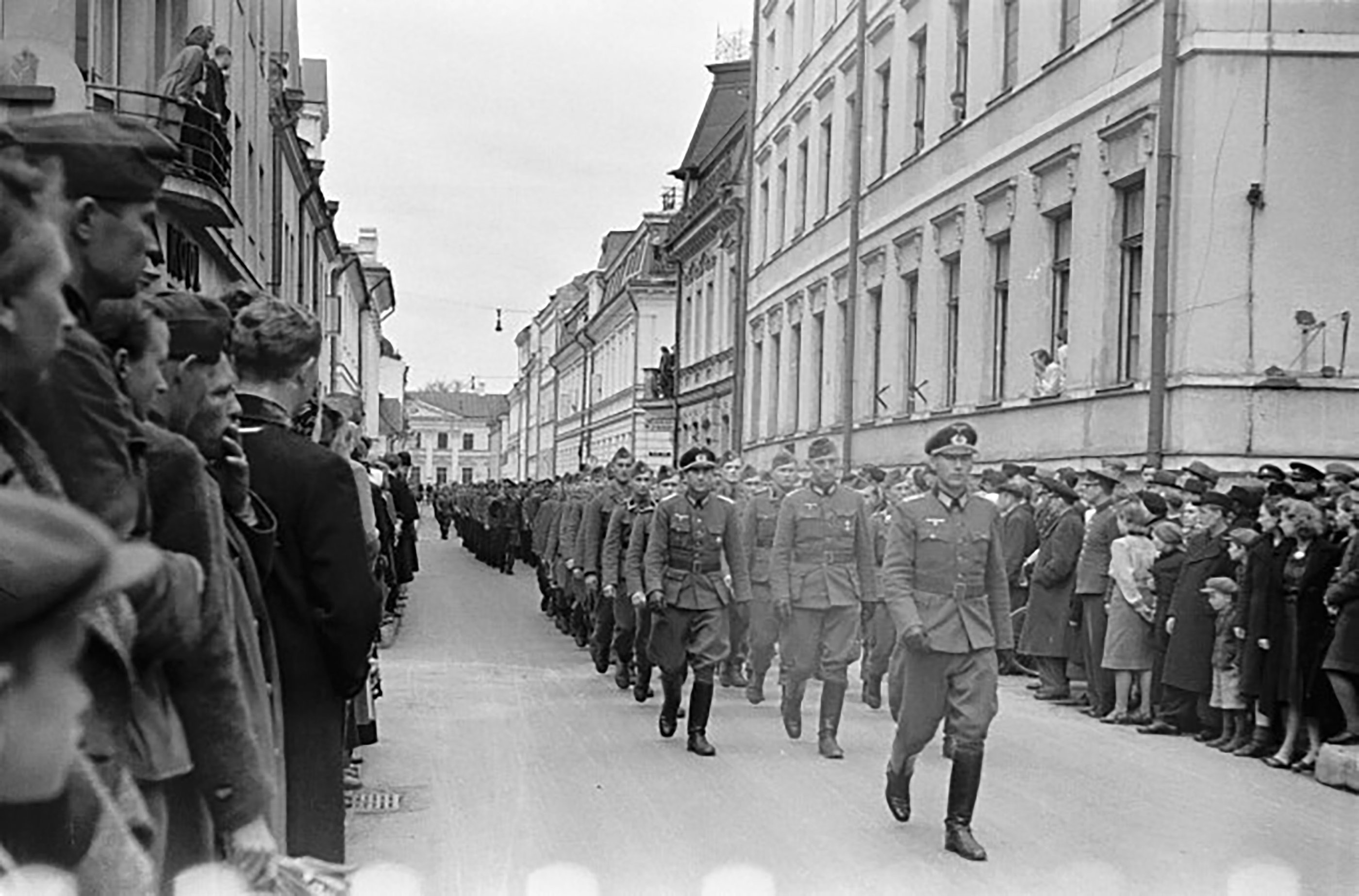 Ees sammub kompanii ülem, ülemleitnant Gustav Vainu, temale järgnevad kompanii rühmaülemad vasakult leitnandid Jaan Sepa, Helmut Rõõmusaar, ning kahjuks ei ole pildil näha Vainu selja taha jäänud Jaan Lumerat.