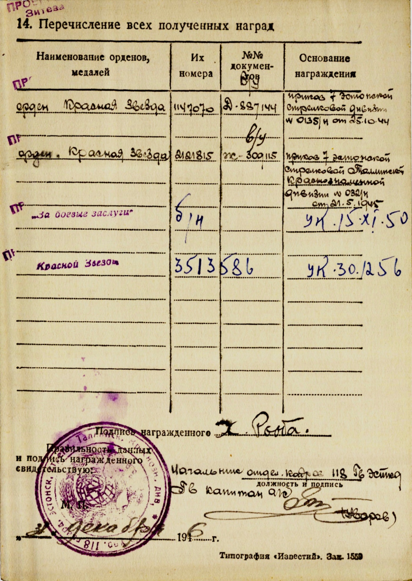 Andmebaasi Kuulsuse III klassi orden nr. 532661, antud 1945.a kellelegi Eesti Laskurkorpusest ja seda ilmselt haavatasaamise eest.