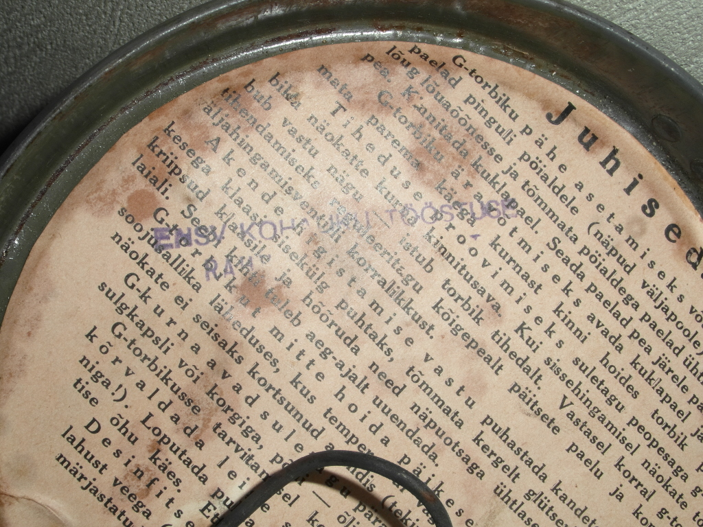 Kas see võib olla näiteks kaitseliidus kasutatud gaasimaski jäänus? Metallosad on pronksist treitud, kokku annavad üsna arvestatava kaalu koonu otsa. Silmaklaasid on päris klaasist(ARS 41 tunduvad tsellofaanist olevat), Kandepael on kinnitatud veidralt ümber kurnastutsi, pealisriie nagu venivast trikookangast, all 3 mm punast kummi( tõenäoliselt kautšuki baasil). Number tundub olevat 18689.