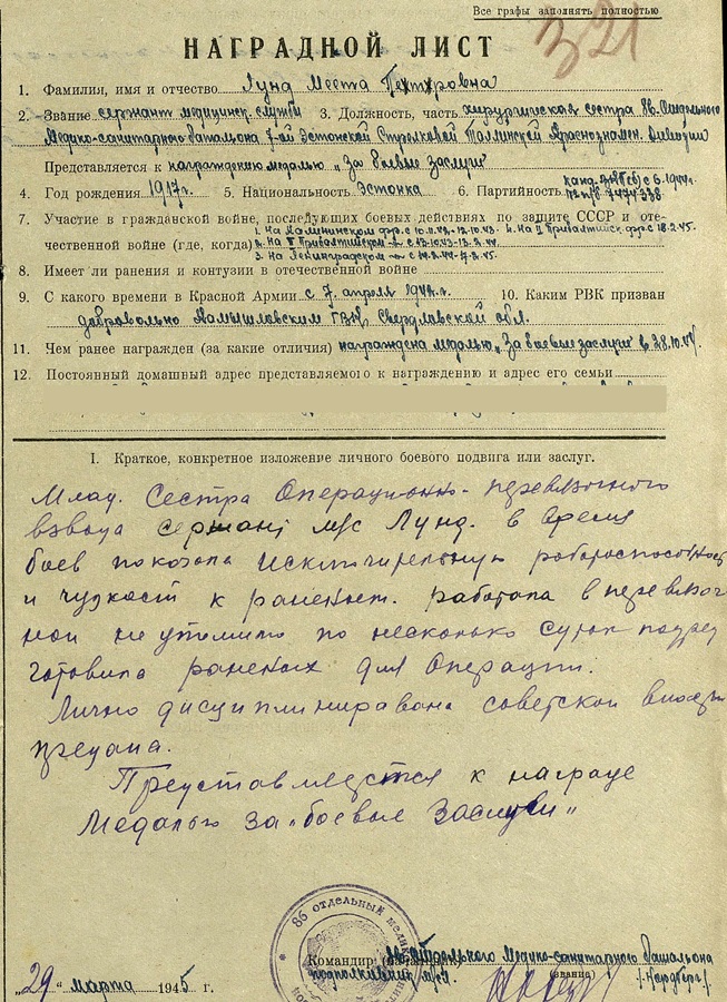 Järgmisena mitmetes korpusemeeste mälestusteraamatutes mainitud meditsiiniõe autasud. Meeta Lund, kahekordne Lahinguteenete medali kavaler. Mõlemad medalid on numbriga.