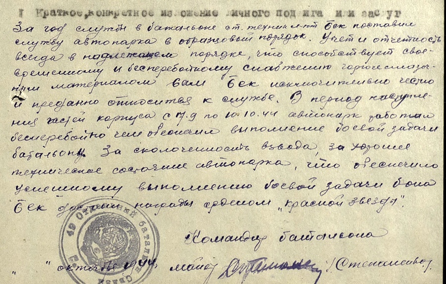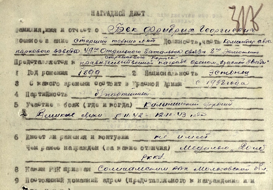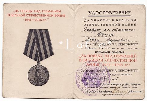 Nüüd aga Kindralleitnant Lembit Pärna allkirja kandev tunnistus medalile Võidu eest Saksamaa üle. Medali on saanud kaardiväe vanemleitnant Friedrich Bek.