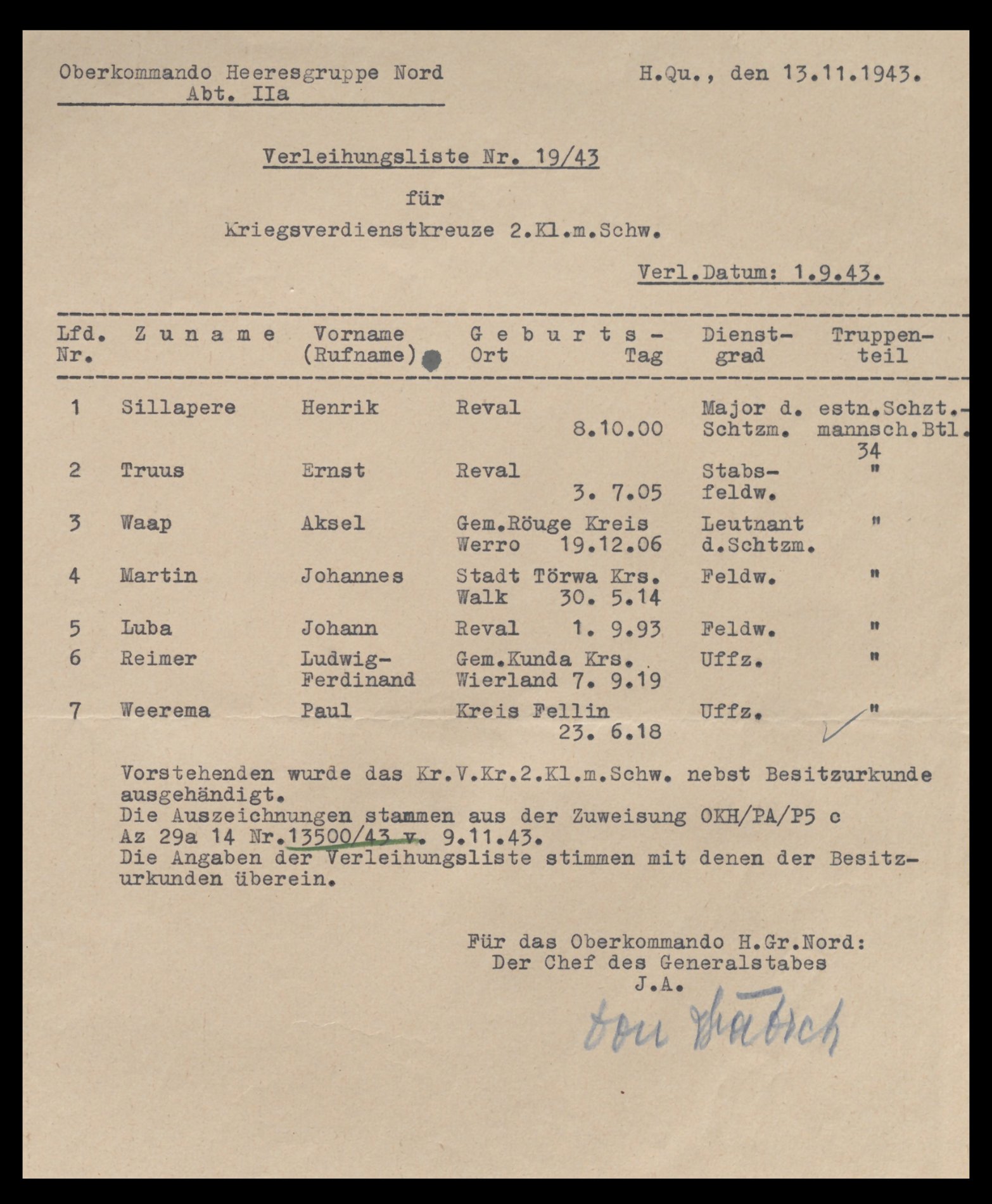 ivalO kirjutas: E Aug 01, 2016 10:24 pm Kui nüüd üles võtta arhiivi materjalid, siis figureerib Sillapere juba 1942. aastal patüli ja leitnantina. Järgmised äramärkimised on kahel korral 1943. aastal ja viimane jaanuarist 1944.