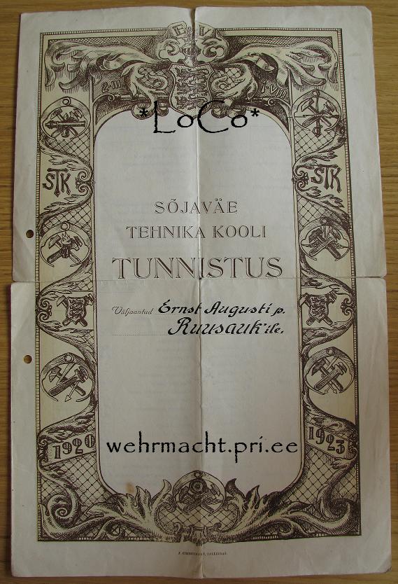 Sõjaväe Tehnikakooli I lennu (1920-23) lõpetanud Ernst Ruusaugu tunnistus. Kooli vastu võetud kadetid määrati osakondadesse nende omal vabal valikul. Ruusauk oli pürotehnika osakonnas, kus oli kokku 6 meest. Lennus oli kokku ainult 75 meest, niiet üsna haruldane tunnistus!