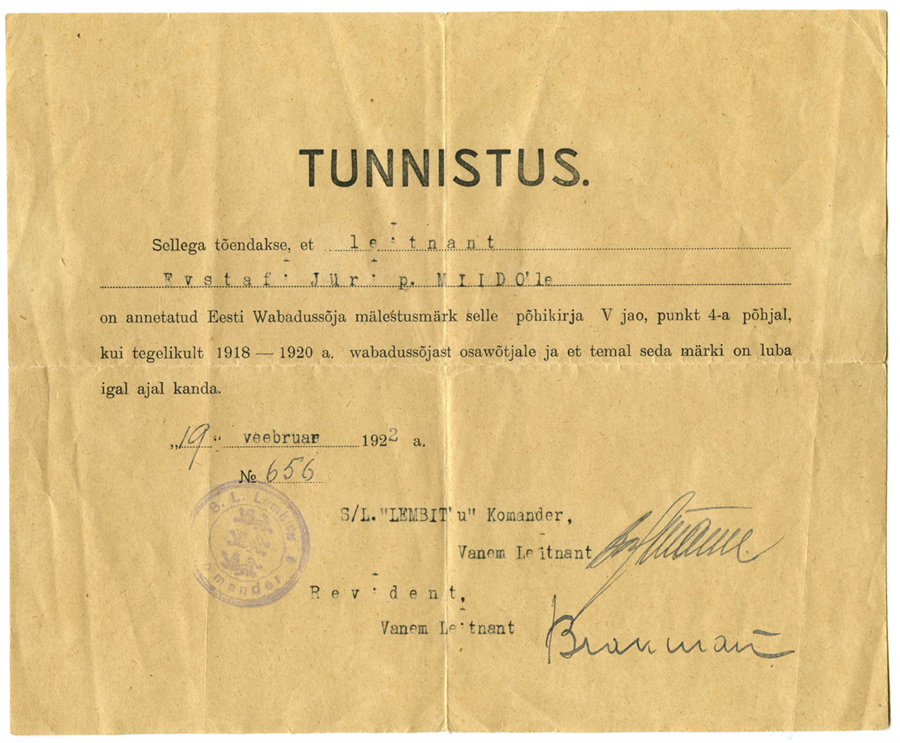 Väike lisa E. Miido komplekti, õnnestus saada ka tema Vabadusristi tunnistus.
