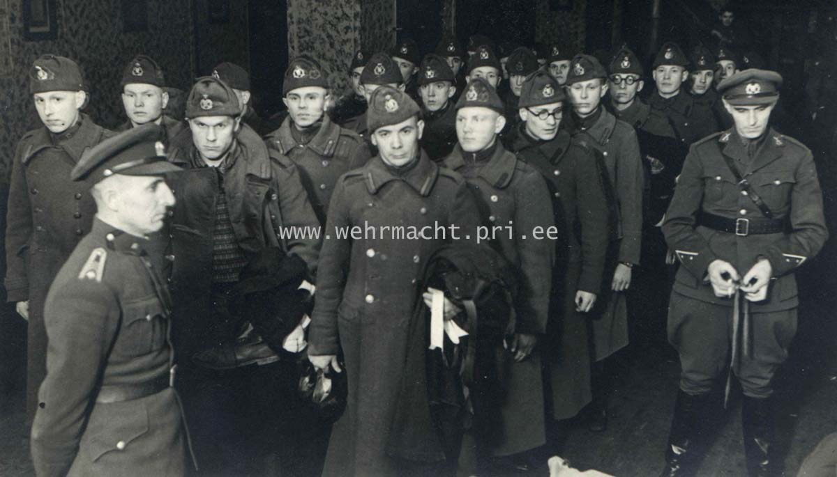 Mehed on vist äsja oma vormiriietuse selga saanud ja annavad parasjagu oma tsiviilriideid ära, kahel kõige ees seisval mehel on selgelt näha käes olevad kingad ja musta tooni riided.