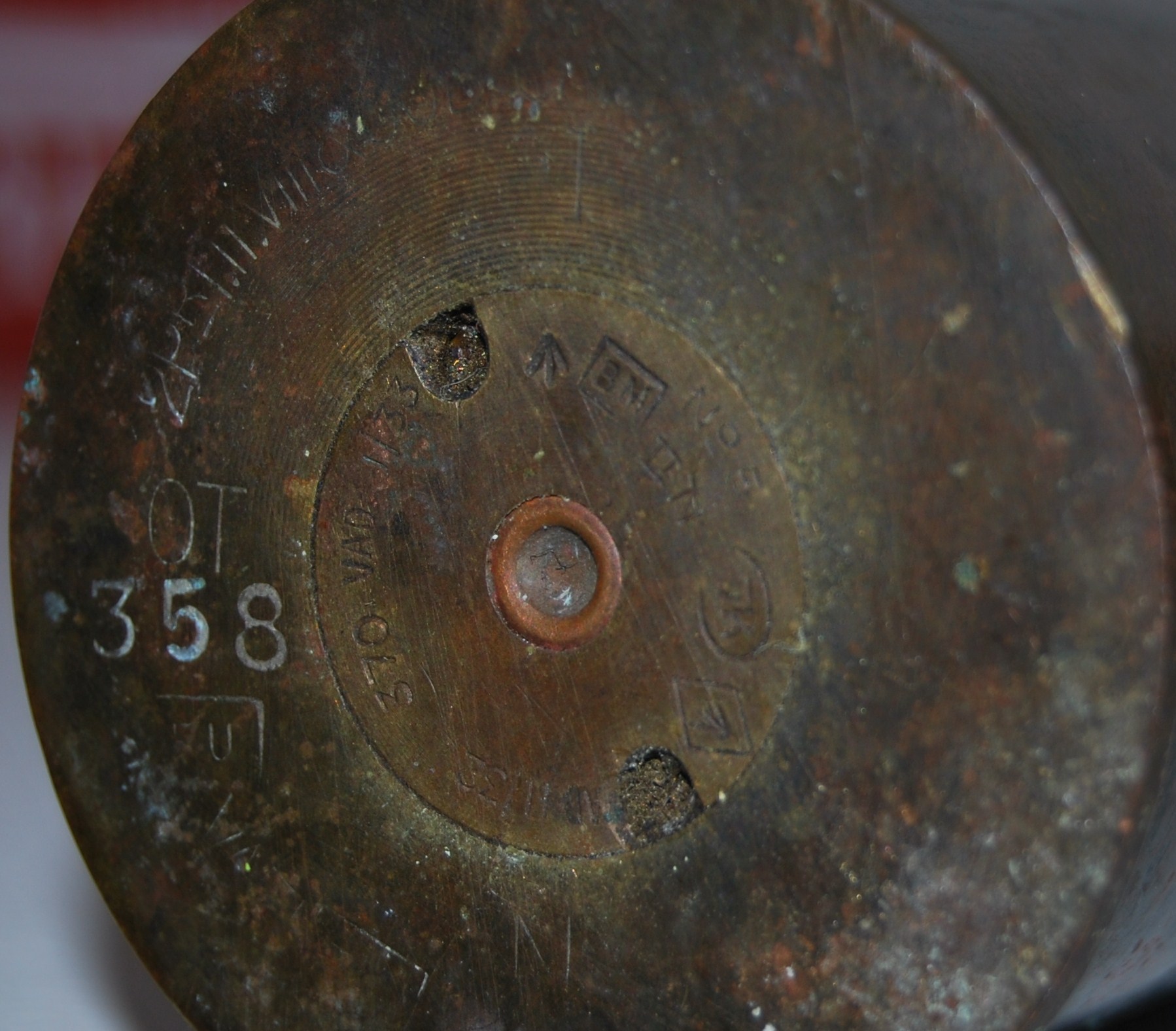 Kahjuks pole võimalik praegu väga täpseid mõõte öelda korraliku mõõtevahendi puudumisel kuid silmajärgi tundub olema silinder ja suudmes u. 40 mm Kirjad peal nii peened, et olin sunnitud tegema macro foto aru saamaks mis seal üldse kirjutatud. Pikkus taas u. 154mm Selle LOT kohta raske öelda kuid võimalik.uudishimulik kirjutas:Kui hülss täispikkuses, siis pane mõõdud (pikkus, suudme läbimõõt ja tagumise otsa läbimõõt). Siis tuvastamine peaks kerge olema?