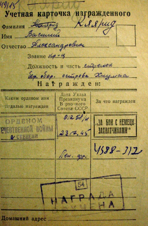 Küll mitte korpus, aga väga huvitav autasustamine tuttava kollektsioonist. Isamaasõja II klassi orden millega on autasustatud laskur Vassili Käärid.