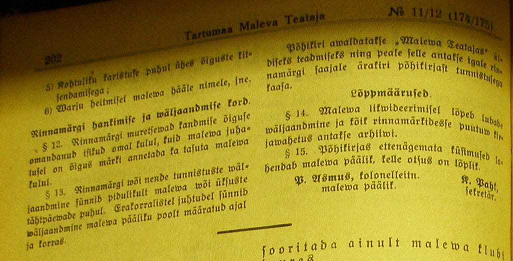 Kunagi mõni aasta tagasi sai soetatud malevale(kuna pole otseselt minu rida) kõik aastakäigud, peale ühe vist mingit Tartu maleva teatajat. (Enam ei mäleta täpselt) Niipalju kui seda patakad lappasin olid sees malevat puudutavad teated-käskirjad. Peaks vist ülesse otsima kus ta on topitud? Loogiliselt võttes peaks seal siis ju kõik annatemised ja statuuduid jne kirjas olema?