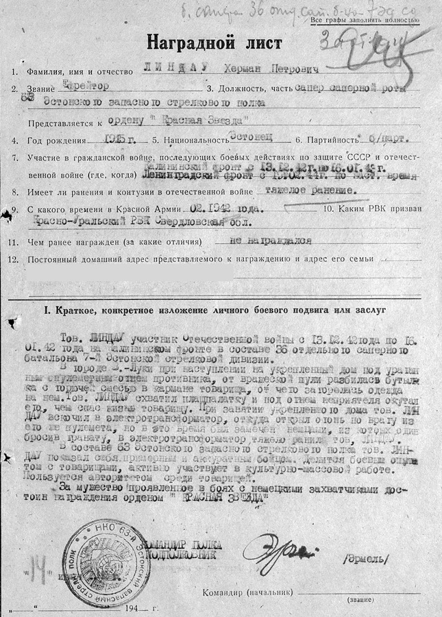 -Esimeselt varasemalt autasulehelt on näha, et Lindau oli tõesti osaline Velikije Luki lahingutes 7.Laskurdiviisi sapööripataljoni koosseisus.