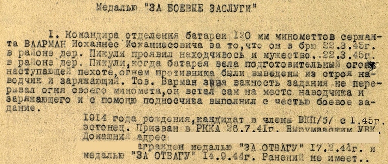 Aga nüüd 300. Laskurpolgu 7. Laskurdiviisi miinipildujate üksuse komandör seersant Vaarmann. Üks Lahinguteenete ja kaks Vapruse medalit, millest üks on puudu- rõngas on medali küljest ära murdunud. Vapper seersant- Rõzenino küla juures Pihkva oblastis sai 1944.a ühe Vapruse medali, Pikuli küla juures Lätis 1945 a. Lahinguteenete medali, mille eest teine Vapruse medal anti on veel hetkel teadmata.