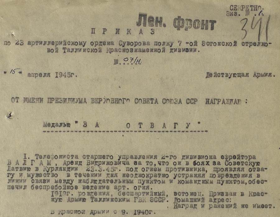 E. Laskurkorpuse 485. Suurtükiväe haubitsapolgu vapper telefonist, kaardiväejefreitor Arend Valgam. Vapruse medali kavaler.