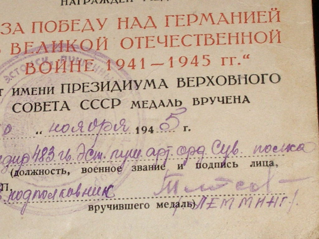 No kuule, see ju heas, igapäevases vene keeles kirjutatud. Mida keeletunni ajal koolis tegid? "Kaardiväe seersant .....sai 10 nov 1945a 483 kaardiväe Eesti, Suvorovi ordeniga autasustatud kahur-suurtükipolgu komandöri kaardiväe alampolkovniku Lemmingu poolt mõistetud juks medal kätte. Veel tänu ksf Borjale täpsustuse eest.