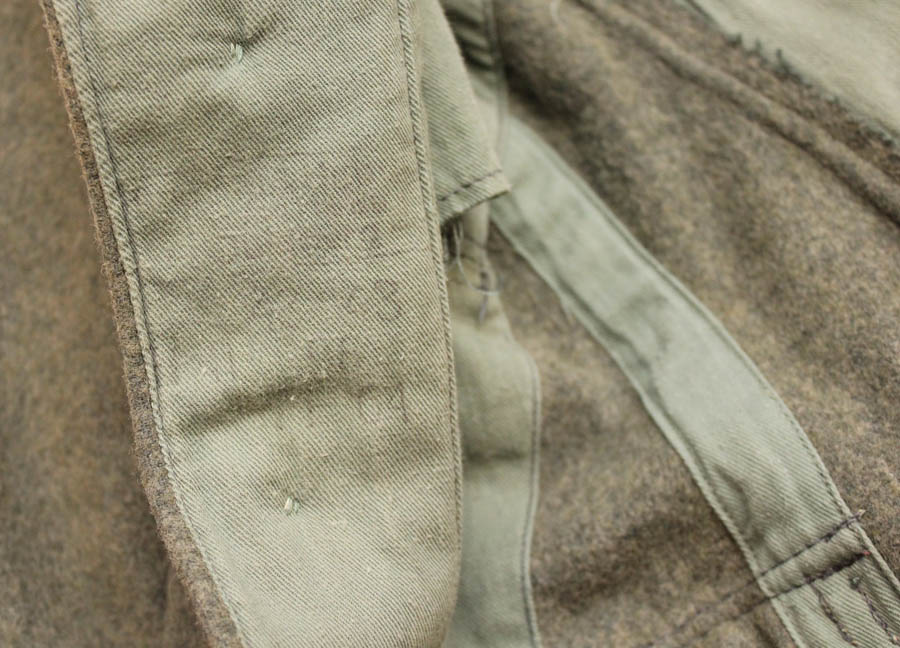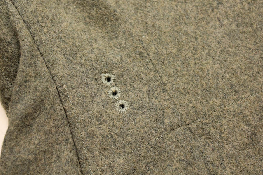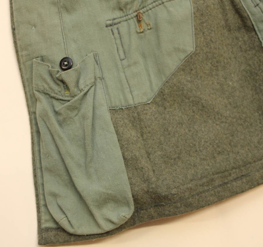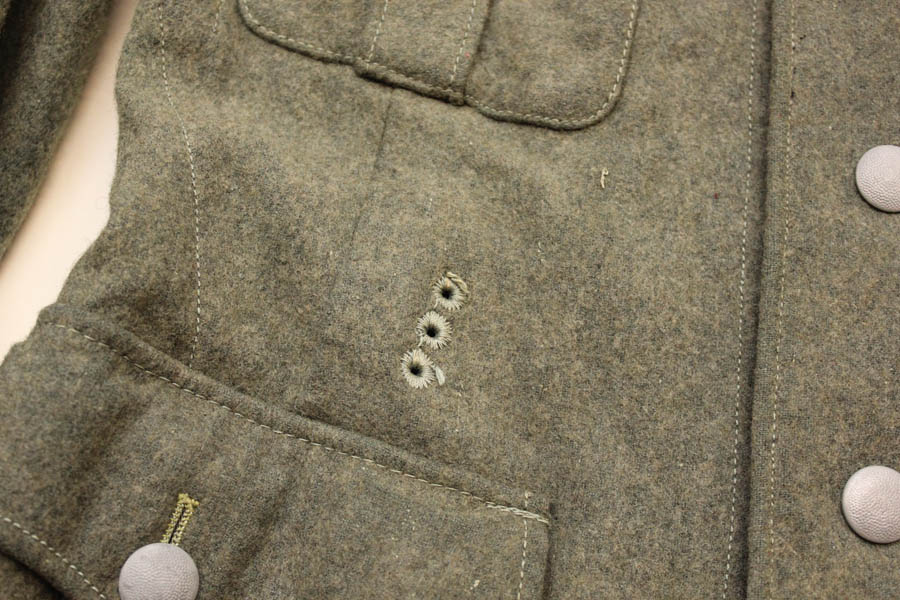 Originaalis on peal olnud Wehrmacht'i embleemid, mis on hiljem asendatud SS embleemidega (niidid osaliselt siiani sees ja vaja välja harutada). Vasakul varrukal kaks väikest auku, kui see defekt välja arvata siis tegu peaaegu, et kandmata kuuega.