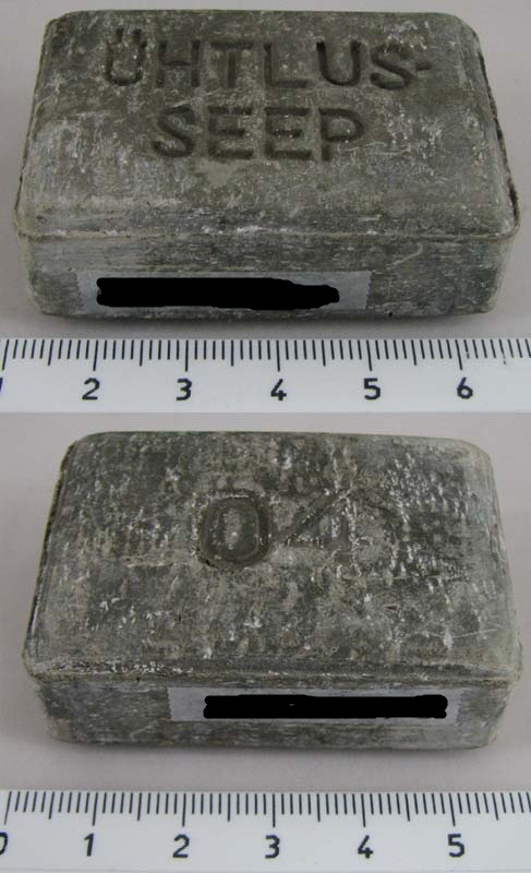 2) Seep, arvatavasti 1941-44 aastatest, kandiline. Peal kiri: Ühtlusseep, alumisel küljel 04. Saksa okup. aegne, jagati 1941. aastal tšekkide alusel. 1942. aastal tuli uju-seep (ujus vee peal). Vt.ka pilti.