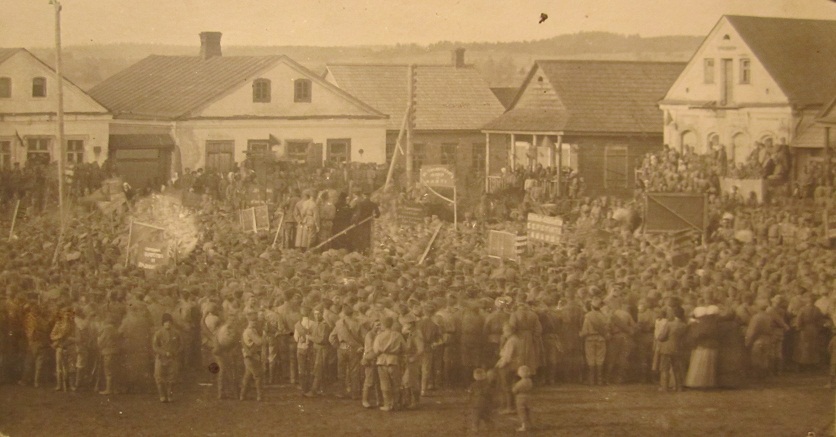 Revolutsioon on jõudnud tsaari armeesse. Soldatid on kogunenud plakatitega kõnekoosolekule.
