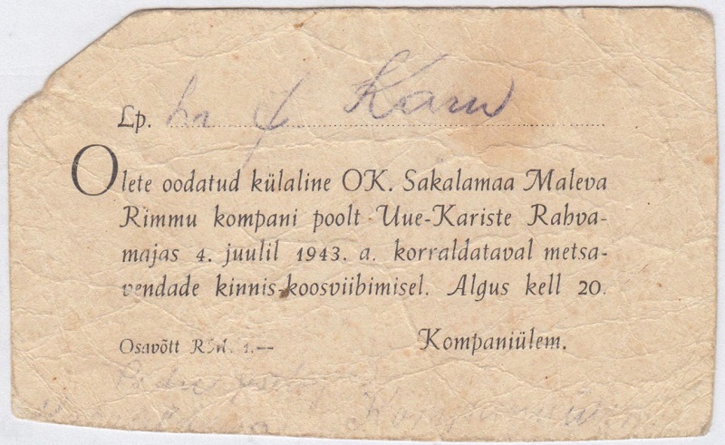 Kutse metsavendade kinnisele koosviibimisele 1943.a.