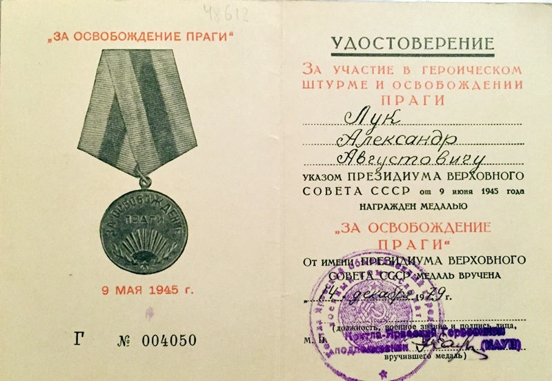 Kohtla- Järve sõjakomissariaadi poolt välja antud Praha vabastamise medali tunnistus. 1979