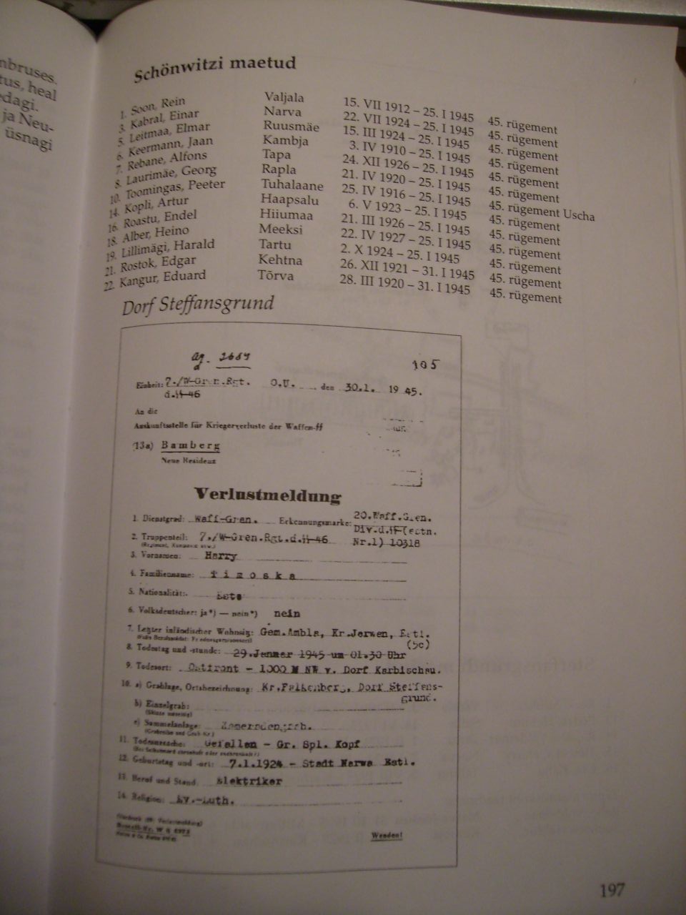 Juba toimiku esilehel on üks neist 23 eestlasest kes Schönwitzis langenud ja see on 22.04.1927 Meeksi v. Tartumaal sündinud W.-Gren. Heino Alber kes langes 25.01.1945 Drf. Schönwitz / O.Schl. Välipostinumber ehk FP-Nr.: 48958-C ehk 6./ W.-Gren.Rgt.d.SS 45. Surmapõhjuseks on lask pähe ja ta tunnusmärk ehk Erkennungsmarke: 20.W.Gren.Div.d.SS Nr. 10665.