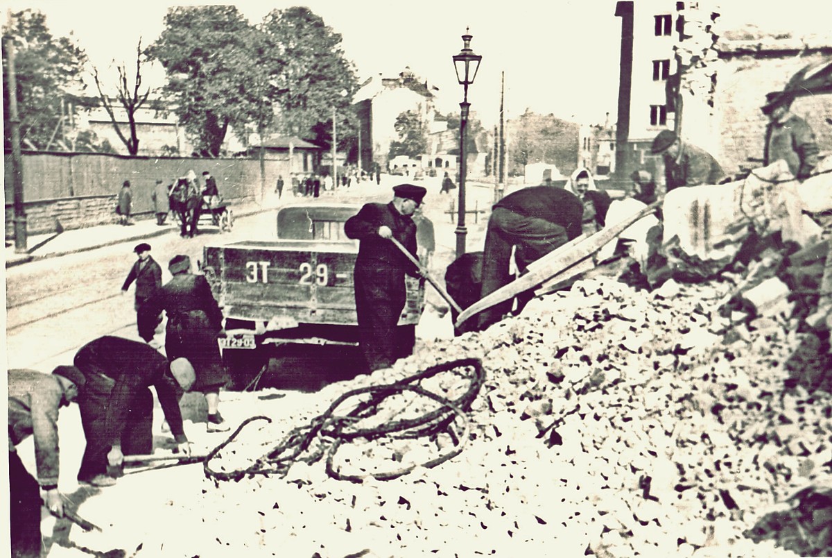 Narva maantee ja Maneeži tänava nurgal asunud hotelli Room varemete koristamine pärast sõda.