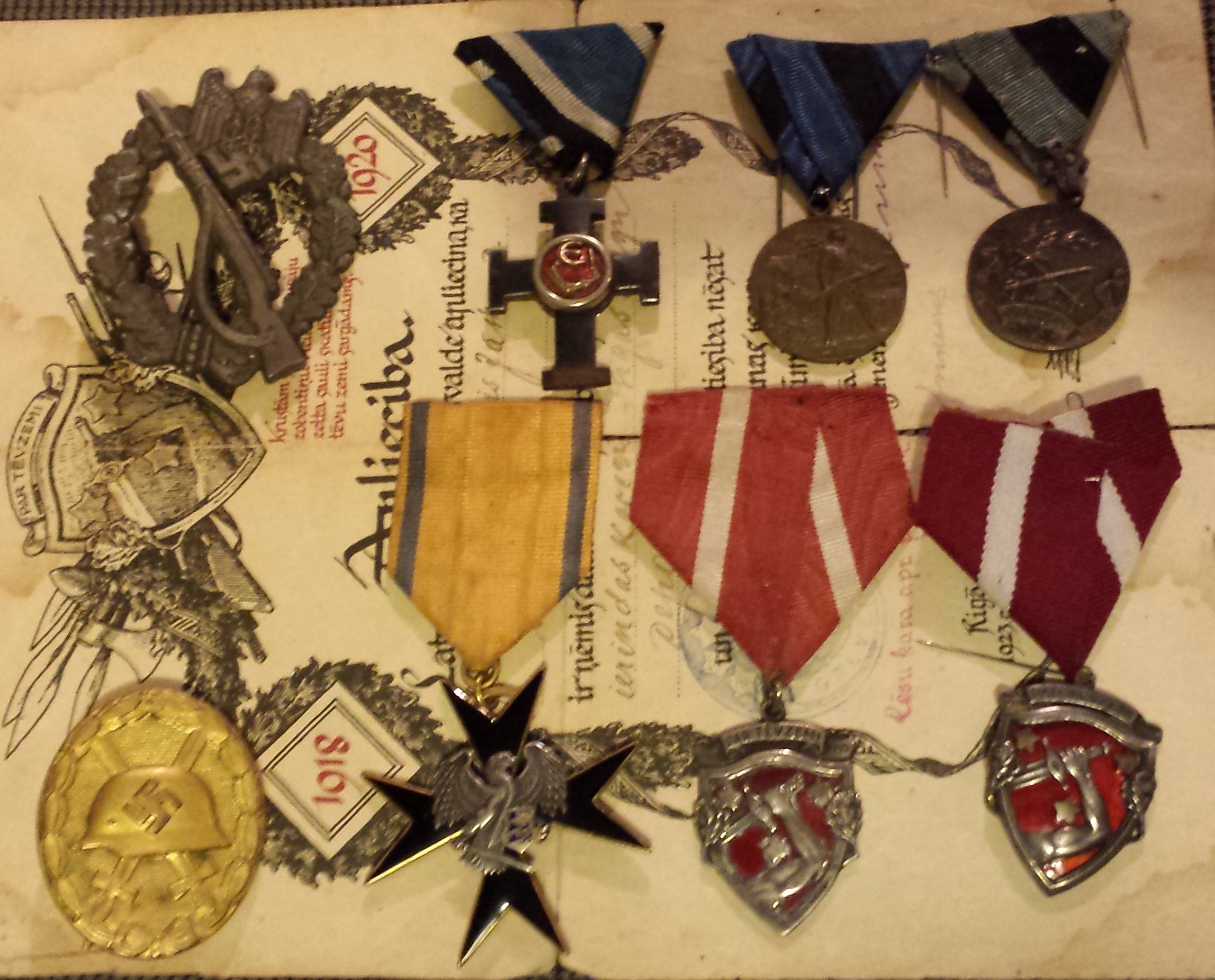 EW Mereväeohvitseri vöörihm, Wehrmacht'i ohvitseri vormikuue rinnakotkas, 4. Üksiku jalaväepataljoni rinnamärk, Punatähe orden koos dokumendiga ja EW Tuletõrje teenistusvanuse märk.